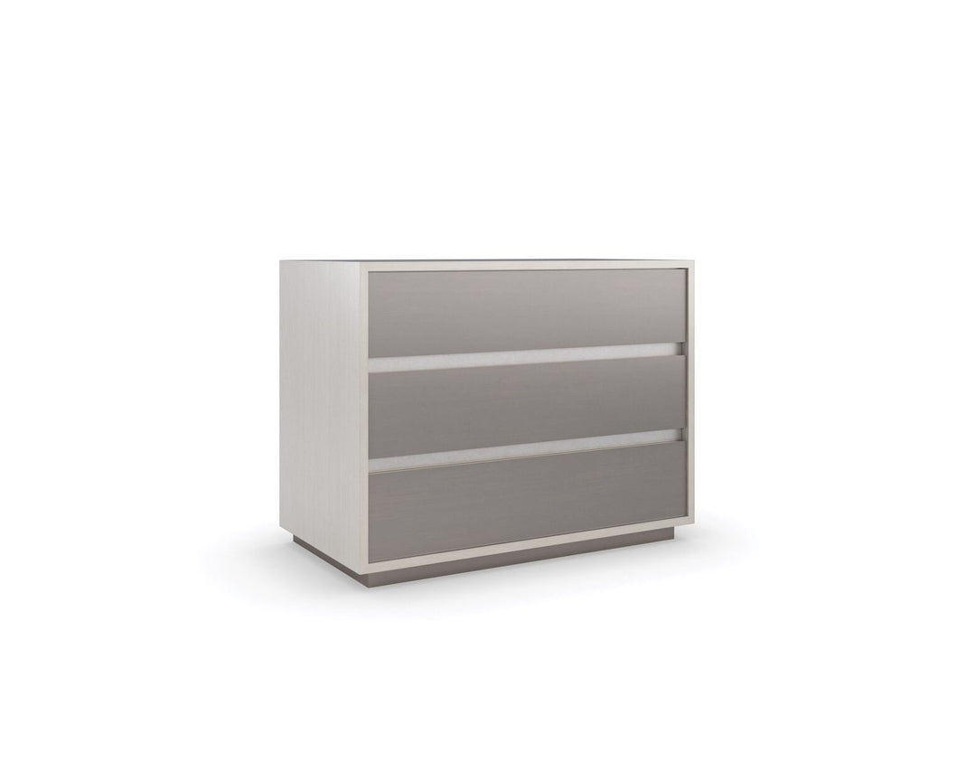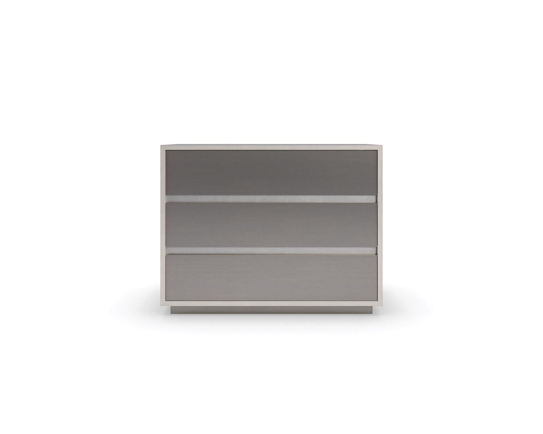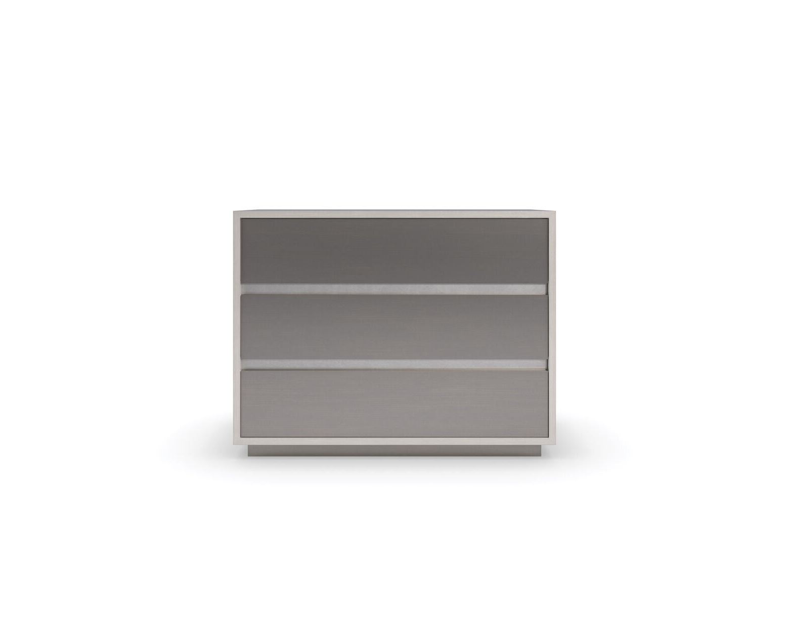 A streamlined style in a monochromatic palette, this large nightstand brings an Italian modern aesthetic to bedroom interiors. Its architectural profile features three spacious drawers, finished in a shimmering Smoked Stainless Steel paint. Its overall Thunder finish adds subtle contrast and gives light to the natural beauty of wood. A USB port on the back lets you discreetly charge your smartphone, laptop, and other devices. Case top and sides in Thunder. Case trim in Smoked Stainless Steel Paint. Three drawers with Smoked Stainless Steel Paint drawer fronts and undermount soft close guides. Drawer interior in cream paint. USB port on back.