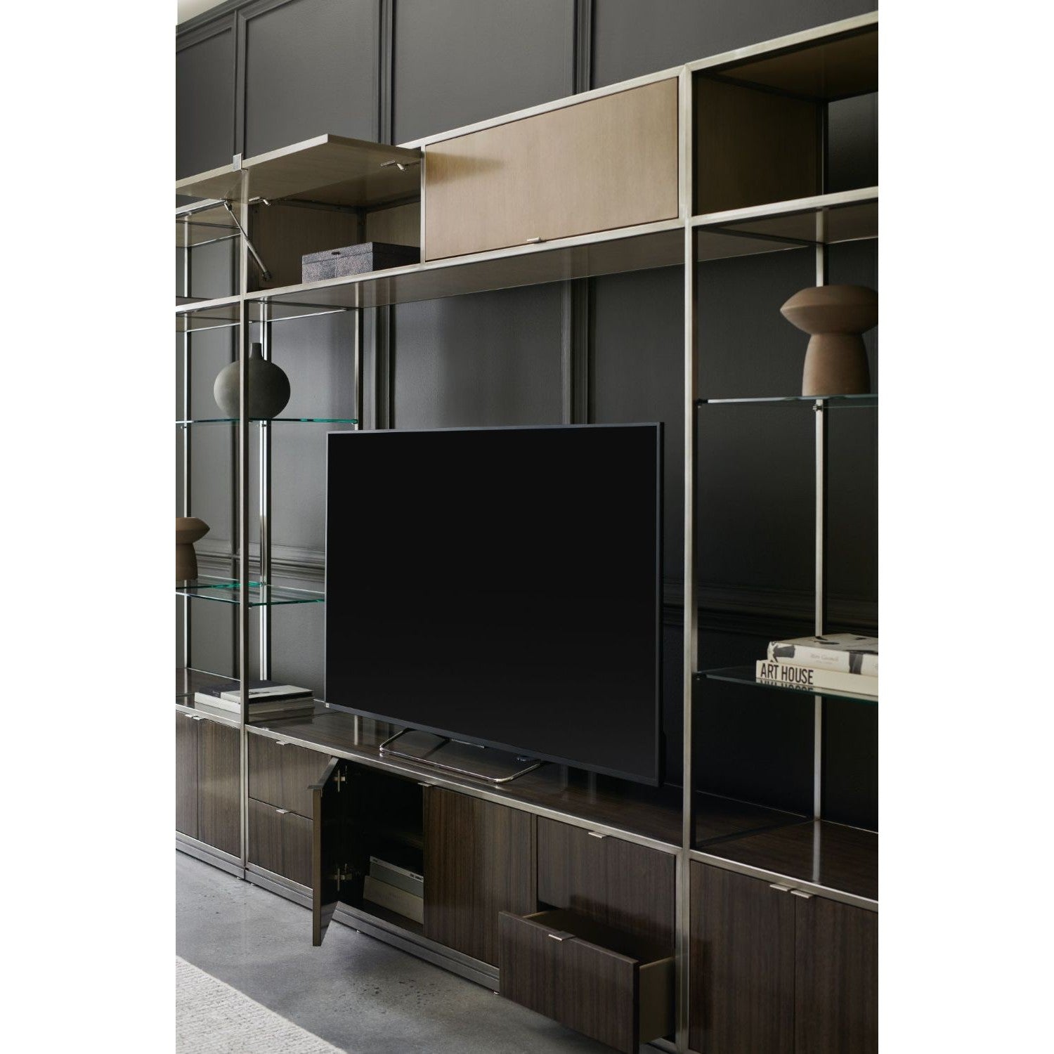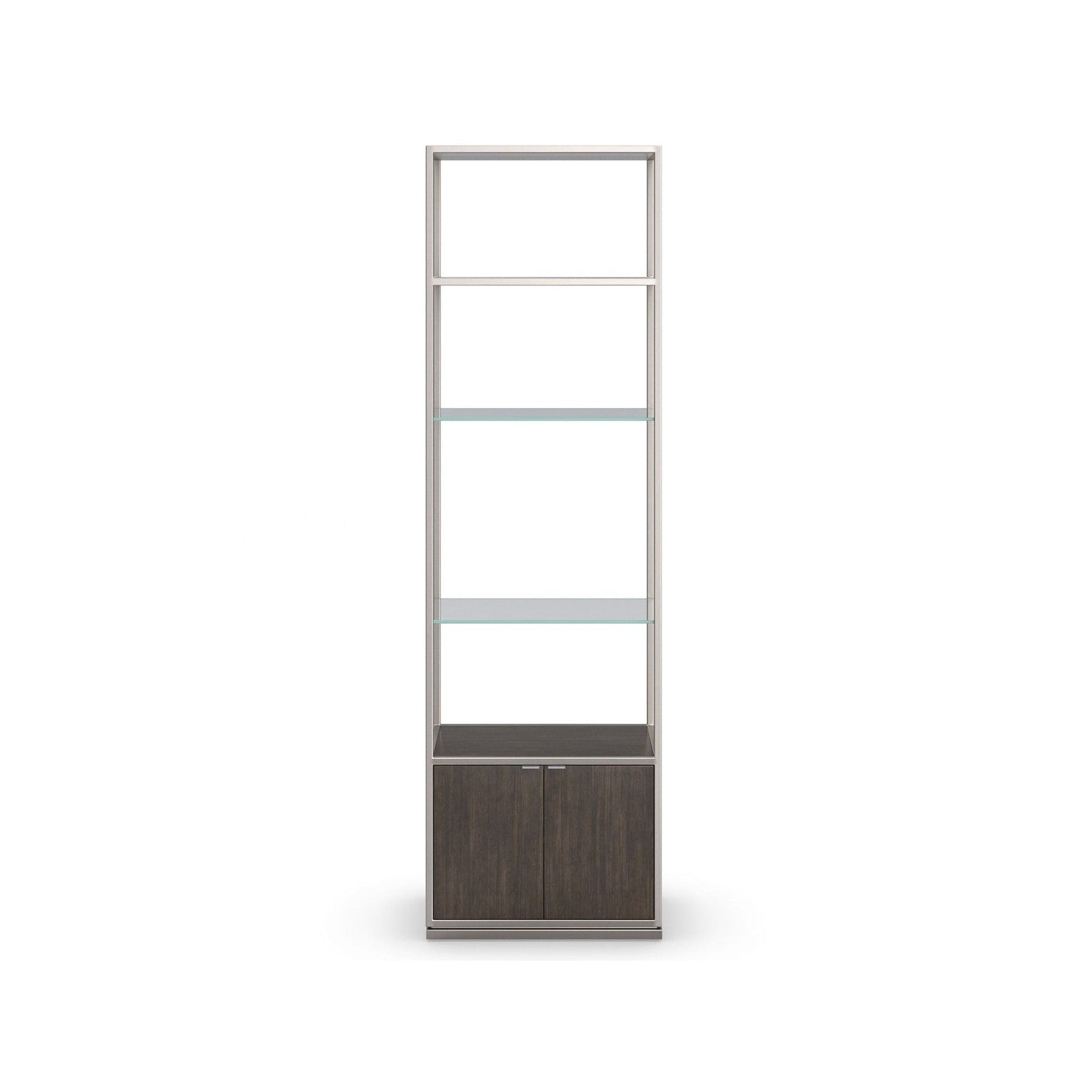 With a towering profile and streamlined design, this Euro-modern bookcase lends a striking foundation. Architectural in form and its refined use of materials, its metal frame is warmly complemented by the warmth of wood veneers. Two stationary glass shelves lend an airy, open space for displaying books and collectables, while wood doors conceal additional closed storage at the base. Perfect for home offices and living interiors, its pairs with our customizable La Moda Base and Bridge display units. Metal frame in Smoked Stainless. One wood shelf and two glass shelves. Top shelf in Thunder. One soft close touch latch door with Sepia front and one interior adjustable shelf. Interior in Sepia. Pairs with M131-421-261 and M131-421-263. When fully assembled can accommodate up to most 82in televisions.