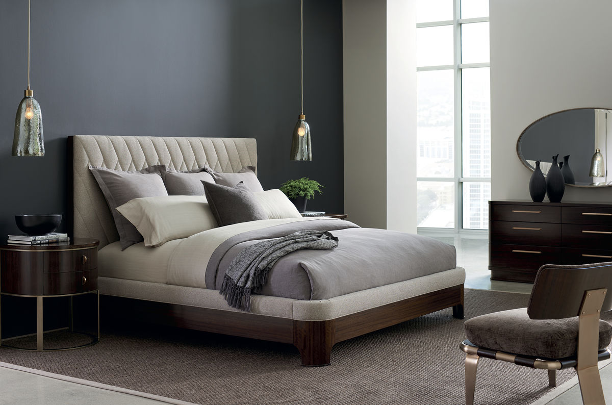This half-moon-shaped nightstand is constructed of fumed figured eucalyptus that has been finished in Aged Bourbon with a high sheen. Two rounded drawers open with custom Smoked Bronze metal pulls in the shape of half-moons. Interiors are finished in a Dark Chocolate painted finish. A Smoked Bronze band outlines the front edge, and the entire piece rests atop a Smoked Bronze metal frame. Case in Aged Bourbon with metal frame and trim in Smoked Bronze. Two drawers with undermount soft-close guides. Drawer interiors in Dark Chocolate paint.
