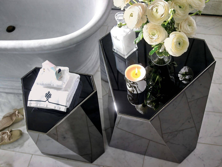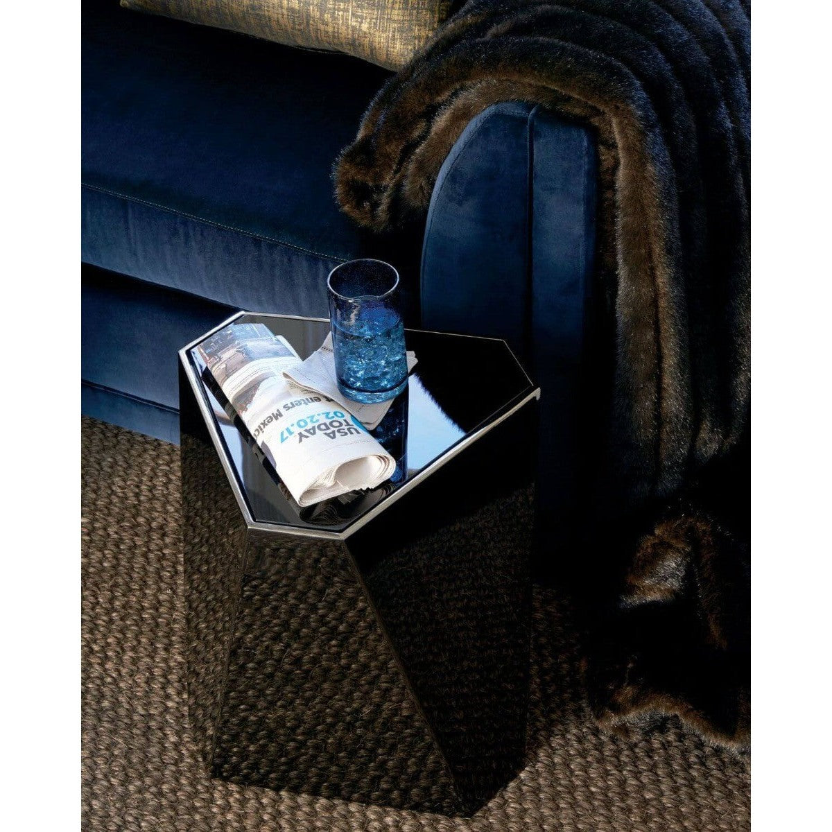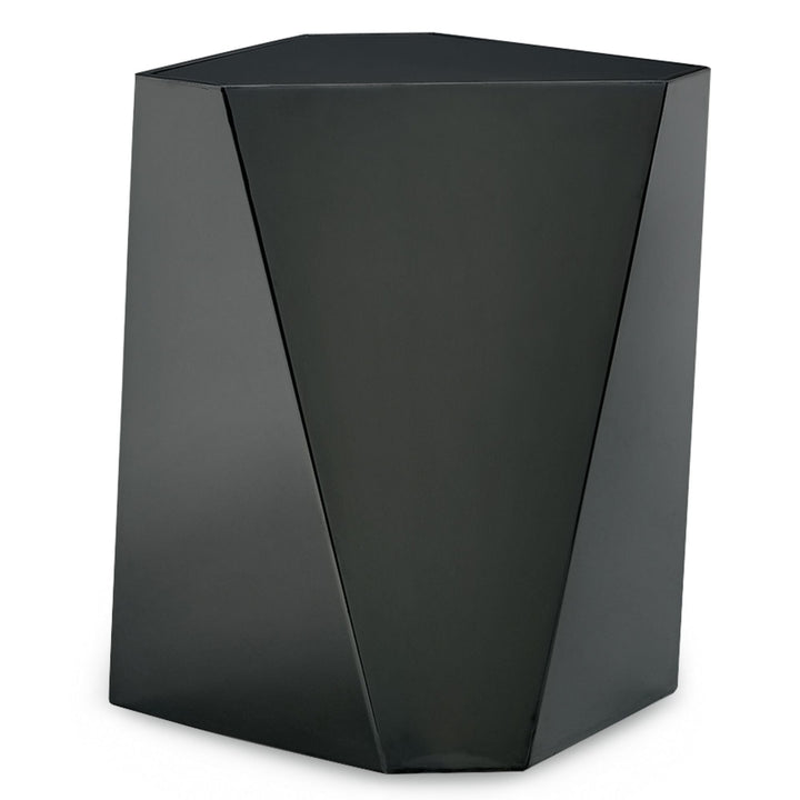 Distinctive design results in a side table that will stir a conversation in any room. The beauty of your decor is given a contemporary edge when it's paired with the irregular angles of this smaller-scaled hexagonal table. The deep bronze base features a black glass top that finishes off this knockout. Place by a chair or sofa or group a couple together for an artistic display. Two sizes are available. Black glass top.