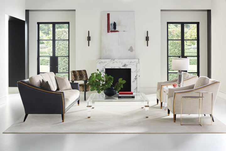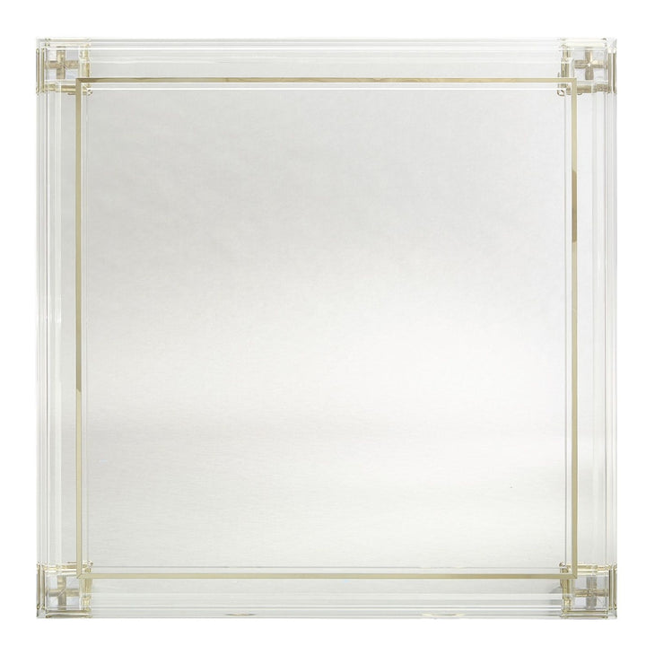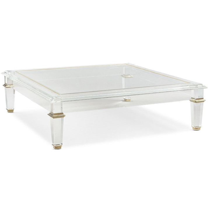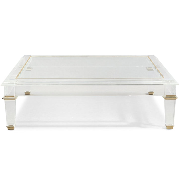 Update a traditional interior or punctuate a modern seating arrangement with our stylish cocktail table. Offering classically inspired clean and classic lines, our Pierre cocktail table comes to life in crisp acrylic. The table's surface features a glass top and the tapered acrylic legs are accentuated with polished brass collars and ferrules. Table top features glass insert. Legs feature Majestic Gold metal collar and ferrules.