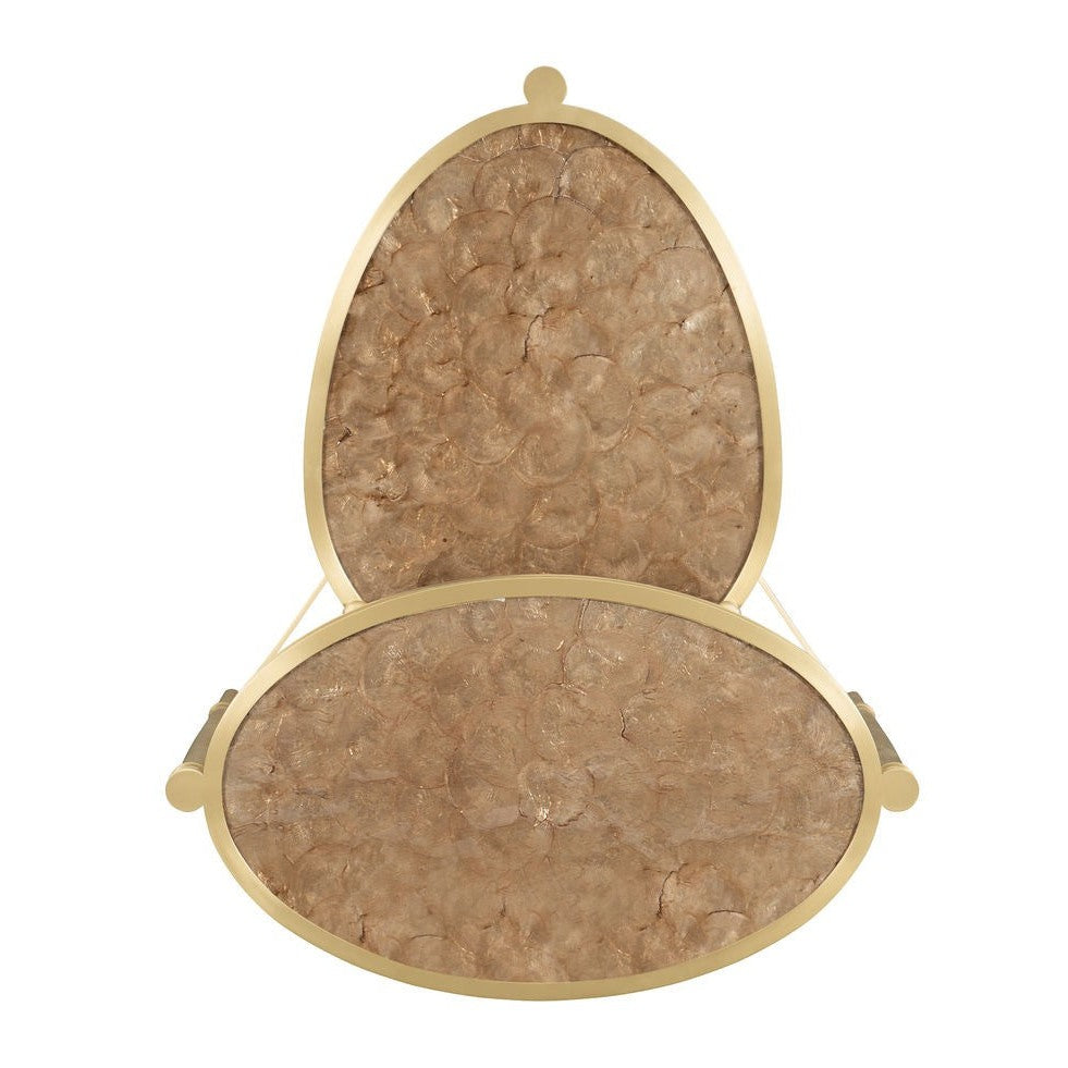 An intriguing amalgamation of forms, this accent table is truly a work of art. Its Capiz shell top surfaces are tinted in a warm golden brown and capture the infinite splendour of nature. A metal-plated frame in Champagne Gold adds a lustrous appeal and defines its shapely stretcher. Position this natural beauty next to your favourite sofa or chair and enjoy the chic glamour it lends to a space. Frame is plated metal in Champagne Gold. Top is Capiz shell tinted in a warm brown tone.