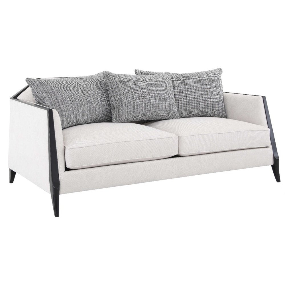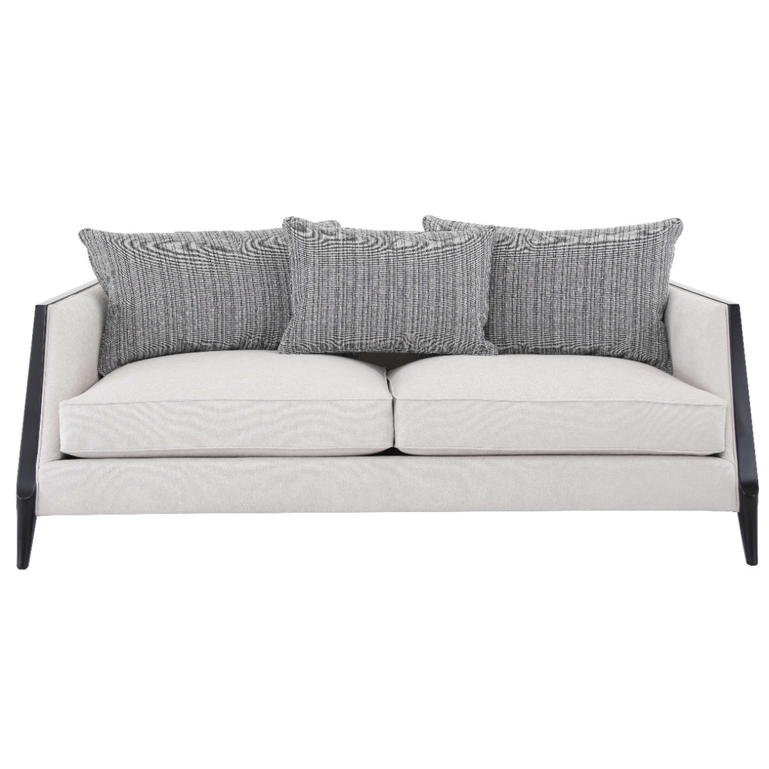 Statement-making from every angle, this modern sofa features a striking silhouette, distinctly defined by continuous clean lines and a slim wood frame. Tailored to perfection, its smooth upholstered back and welted seat cushions offer soft contrast to its Black Saddle finish. Poised on French cabriole-inspired legs, it offers sophistication, with cloud-like comfort. Accent pillows add depth and warm texture. Style with a pair of matching Outline chairs. Body: Finesse ChalkPillows: 2748-91CCSlim wood frame. Loose seat cushions. Tight back.