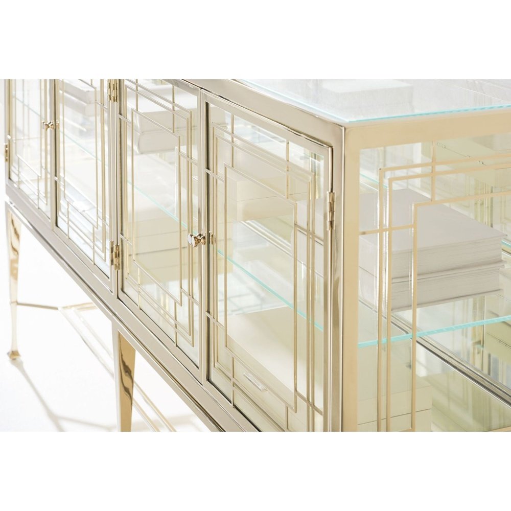 Experience the allure of our glass console, reminiscent of the brilliance found in gold jewellery glistening under radiant light. This exquisite piece captures beauty from every perspective, meticulously crafted with transparent glass panels that create an entrancing visual effect. Its design boasts a glass top, glass end panels, and a glass shelf, all harmoniously complemented by four clear glass doors. These elements converge to create a symphony of luminosity, reflecting elegantly off mirrored back and bottom panels.