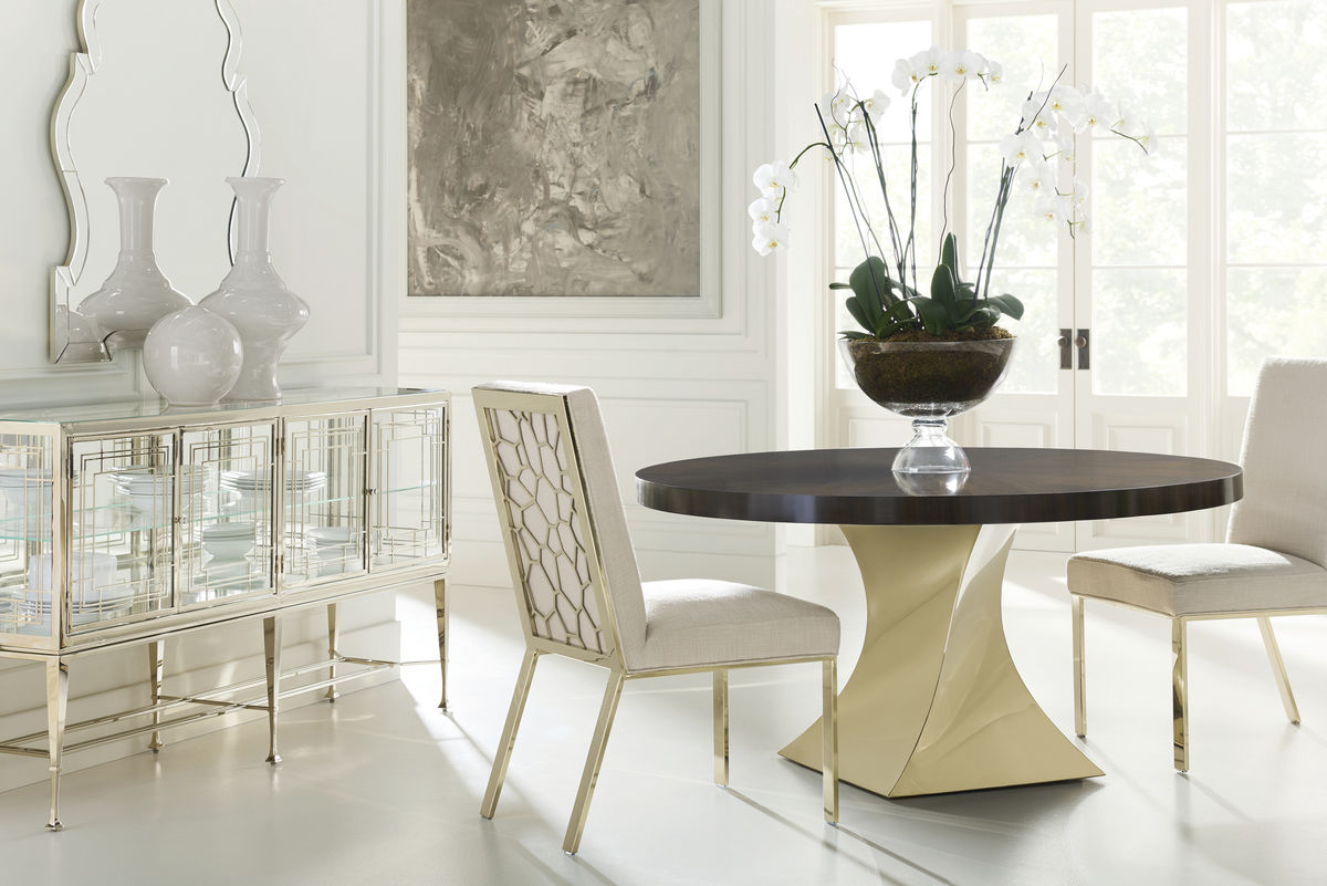 Elevating its elegance, a Whisper of Gold finish gracefully envelops the plated metal frame, bestowing a captivating contrast to its radiant surface. This console serves as an impeccable canvas for showcasing your cherished treasures and curated collections, adding a touch of opulence to your space.