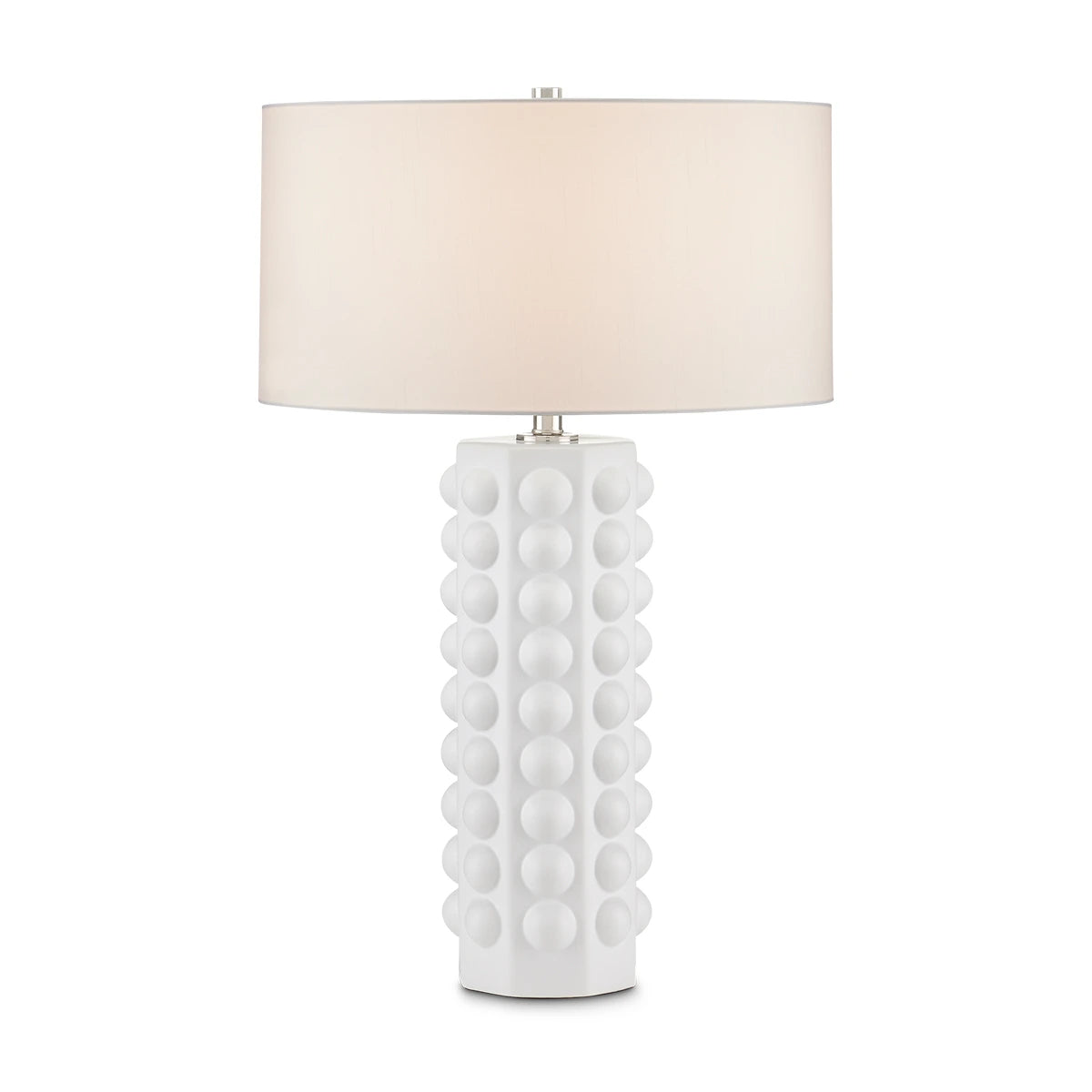 Made of ceramic in a matte white finish, the Cassandra White Table Lamp has a kicky vibe that is one part swinging seventies and one part contemporary. Designed by Clarence Mallari, the Cassandra has a knobby profile that will add depth to its spot in a room. Fitted with a off-white shantung drum shade, this composition has heft and scale to spare.