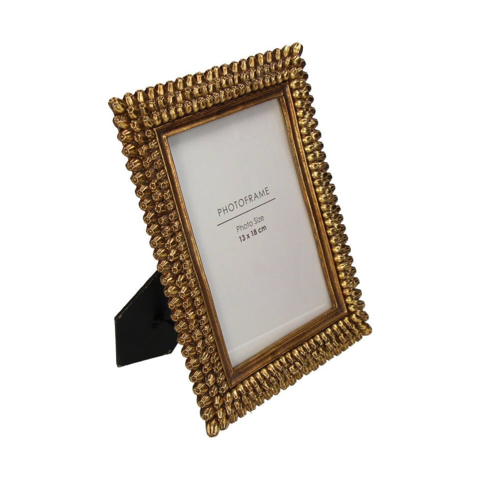 Featuring a textured, radiant gold finish, the Cassia photo frame exudes classic glamour. Crafted from polyresin, its detailed design lends depth and richness to any décor. Sized perfectly for 5"x7" photos, it creates an elegant focal point on desks or shelves, ideal for framing your favourite moments with sophistication.