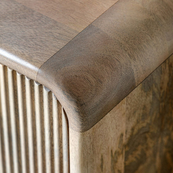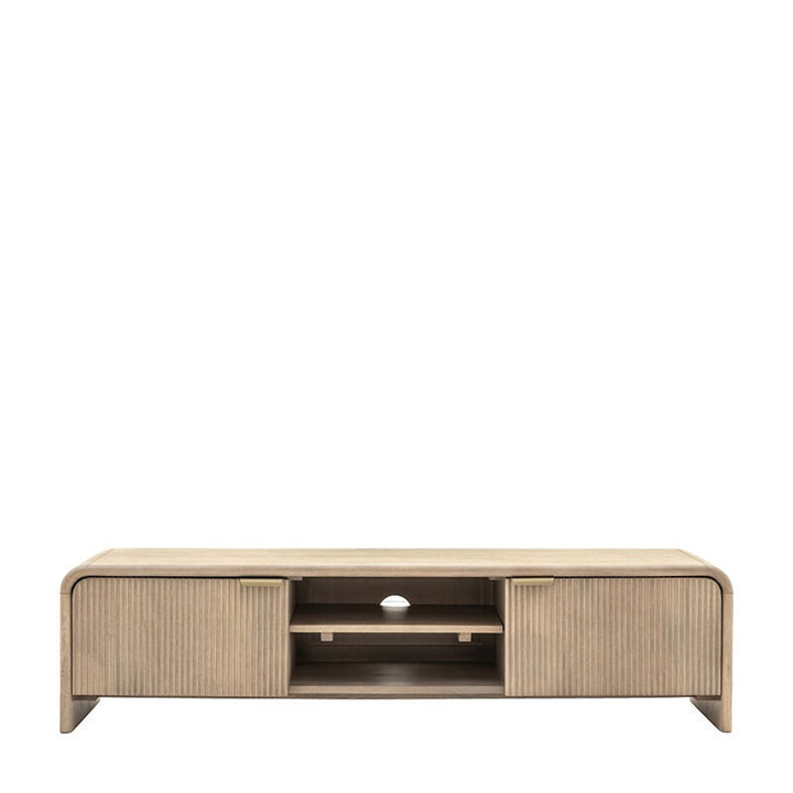 This media unit is a functional and stylish solution for media storage. With a curved top and fluted door detailing, it provides ample space for entertainment essentials. The sleek design fits effortlessly into modern living spaces, offering both organization and aesthetic appeal.