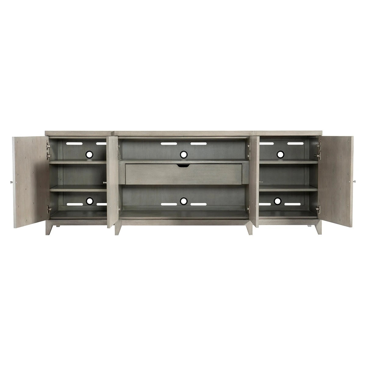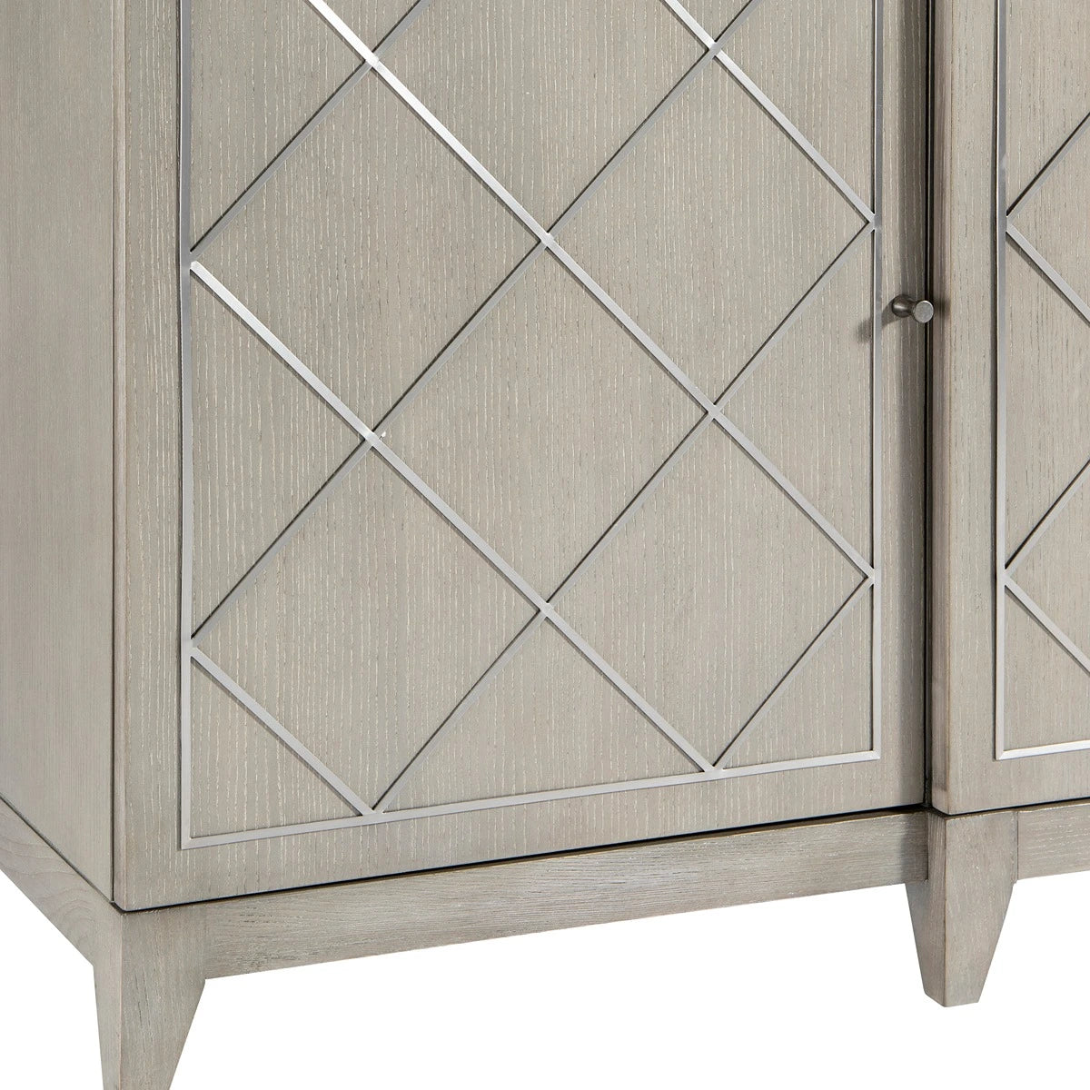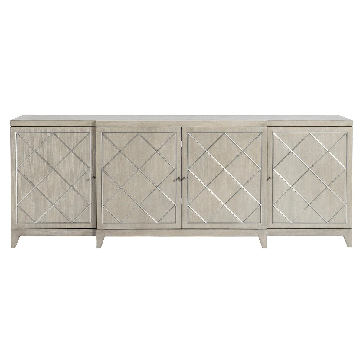 A subtle glamour is revealed in the brushed stainless steel diamond pattern overlay on the Cornelia entertainment credenza's three doors. The gleam of the metal is a perfect complement to the simple lines of the wood case, featured in the Nebbia finish. Each door has one round knob pull in the Glazed Stainless Steel finish. There are two adjustable shelves behind the outer doors and one large drawer behind the center doors.
