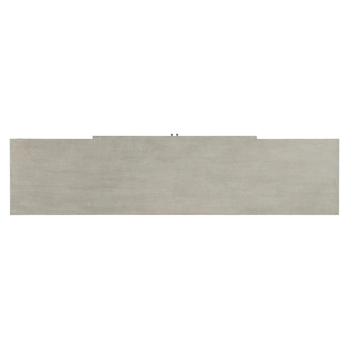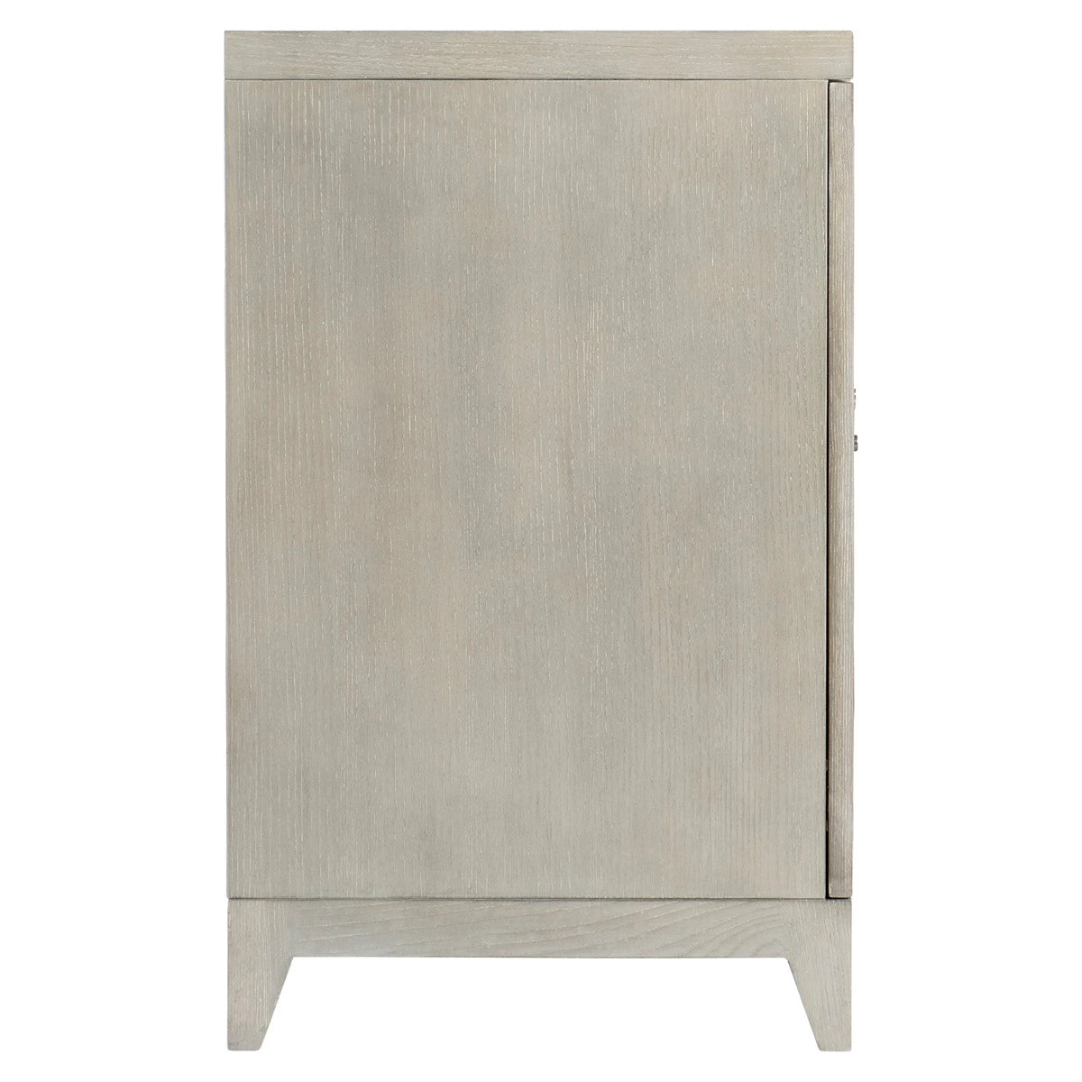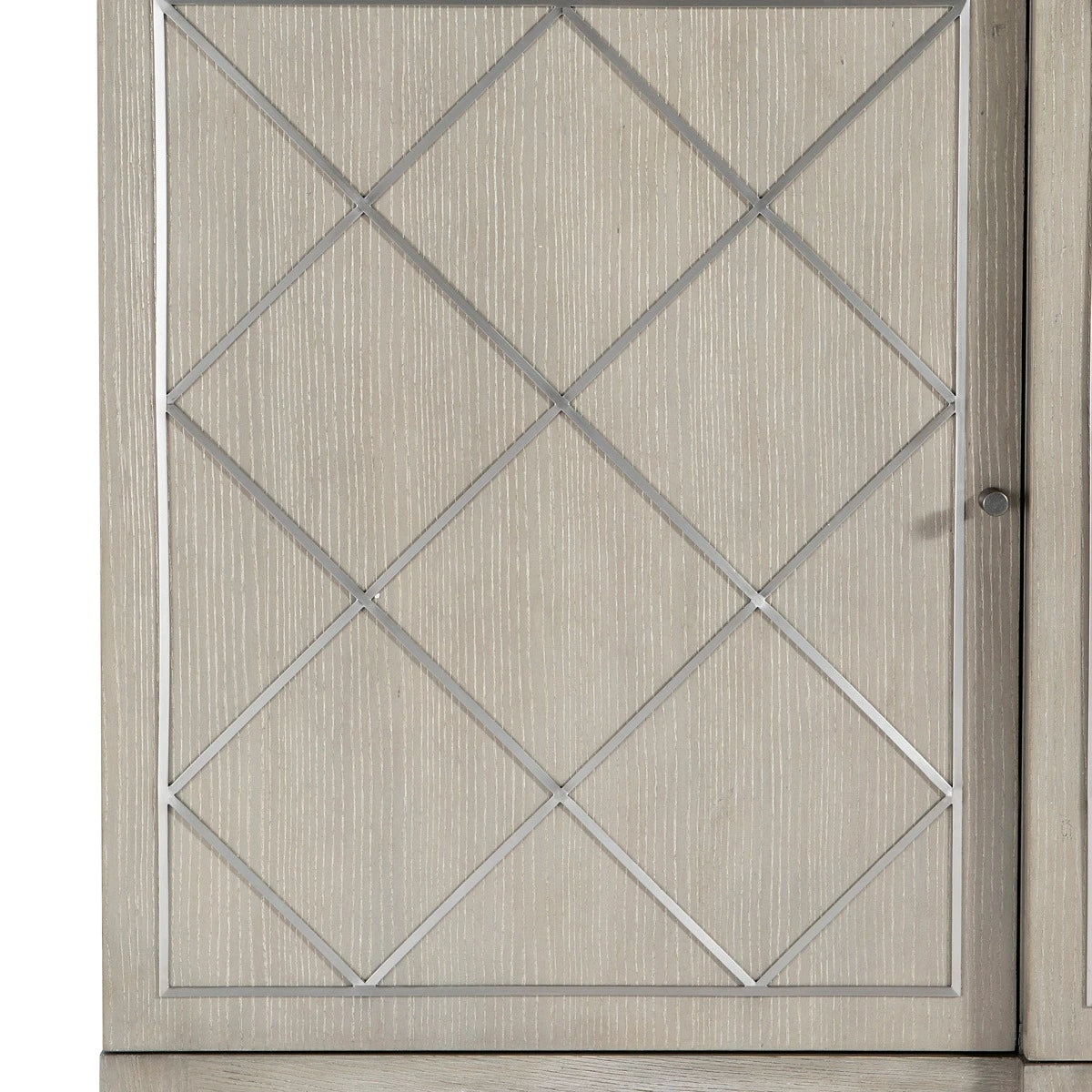 A subtle glamour is revealed in the brushed stainless steel diamond pattern overlay on the Cornelia entertainment credenza's three doors. The gleam of the metal is a perfect complement to the simple lines of the wood case, featured in the Nebbia finish. Each door has one round knob pull in the Glazed Stainless Steel finish. There are two adjustable shelves behind the outer doors and one large drawer behind the center doors.