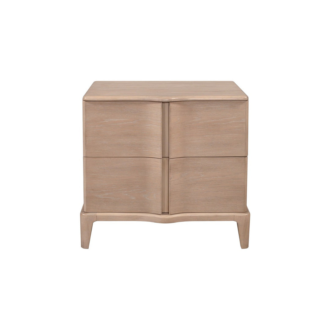 Compact yet striking, this two-drawer side table is perfect for those seeking a mix of functionality and design. Its natural wood finish highlights the beauty of its fine grain, while the smooth curves on the front add a touch of elegance. The spacious drawers provide plenty of room for storage, making it ideal for bedrooms, living rooms, or small spaces that need organized storage. Supported by sturdy, subtly tapered legs, this chest balances durability with timeless style.