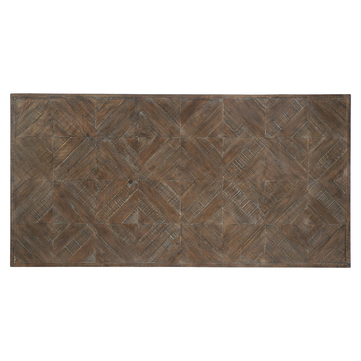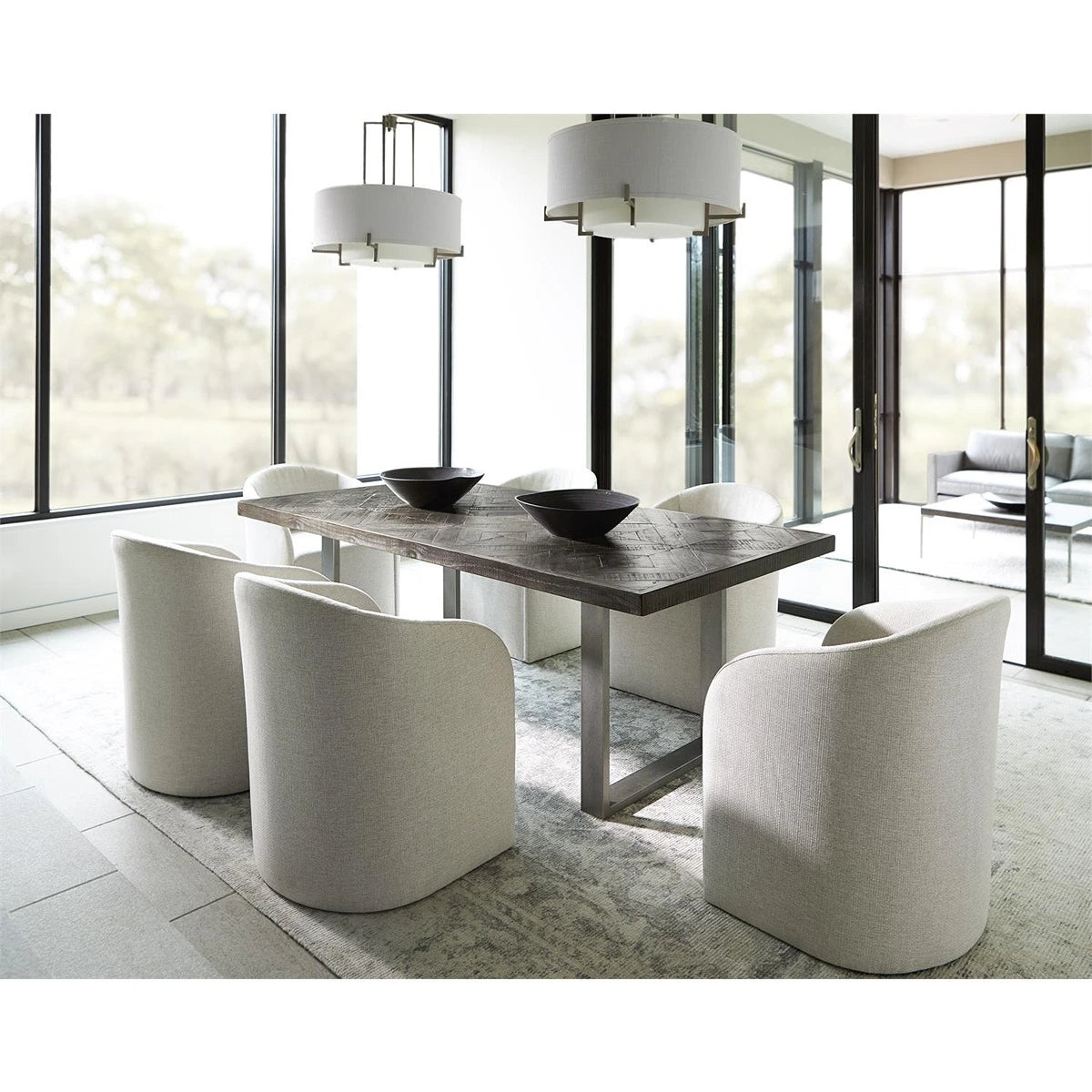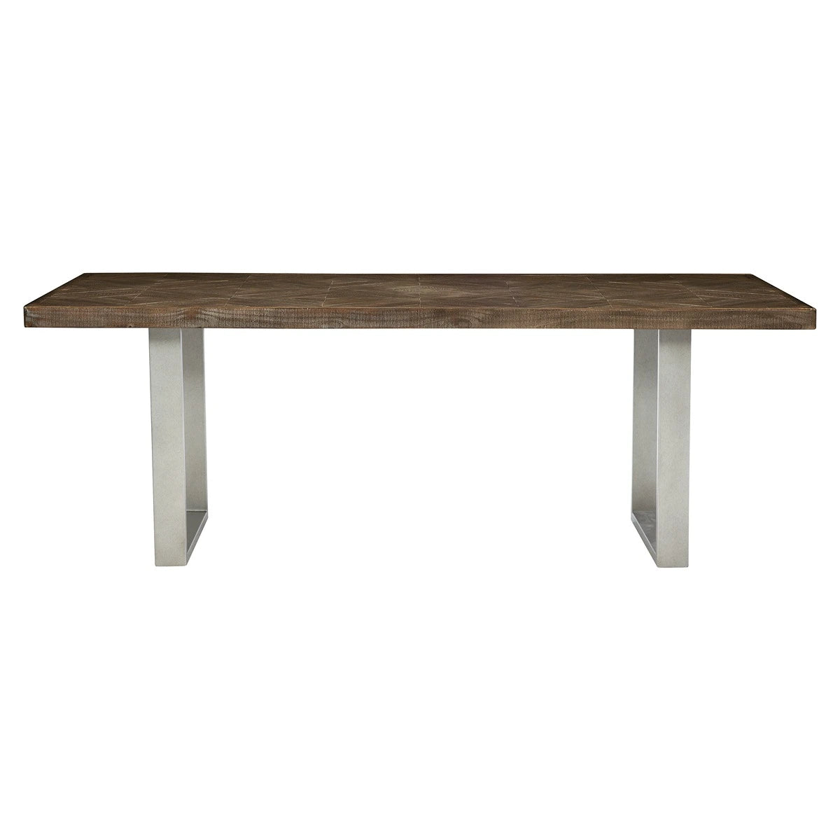 With its architectural structure and minimalist aesthetic, the Draper dining table embodies urban sophistication. The fancy face tabletop is crafted from distressed pine finished in a moody Sable Brown that adds rustic texture. Two open tubular steel pedestals are finished in Gray Mist for a polished, industrial look. Casual in nature, this table brings a hip, edgy vibe to the luxe interior.
