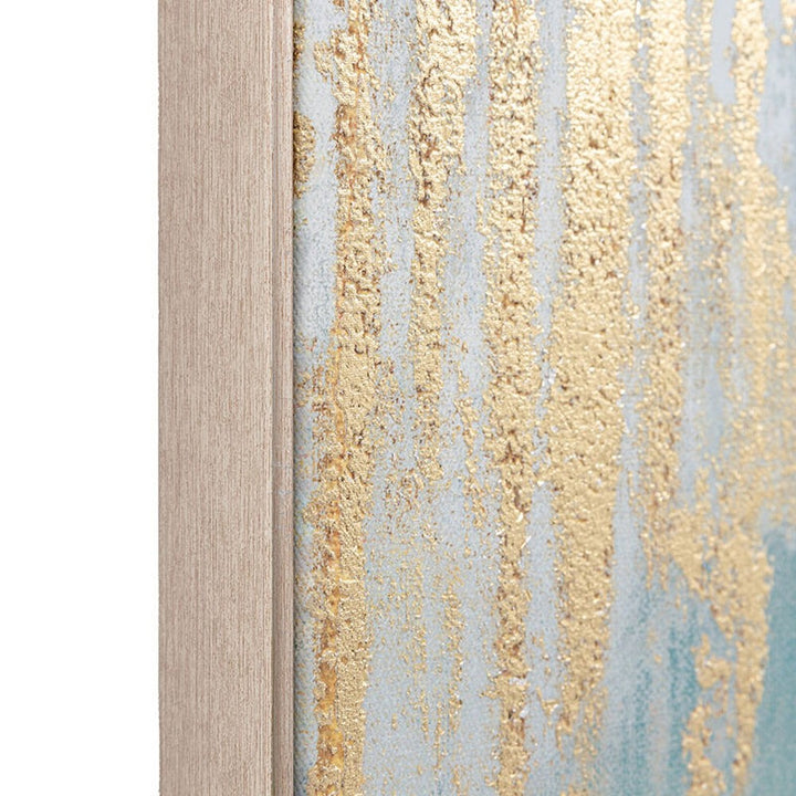 Awaken your walls with the luminous beauty of this canvas. This captivating piece captures the serene essence of dawn, with soft hues of blue and green gently kissed by shimmering gold accents.
