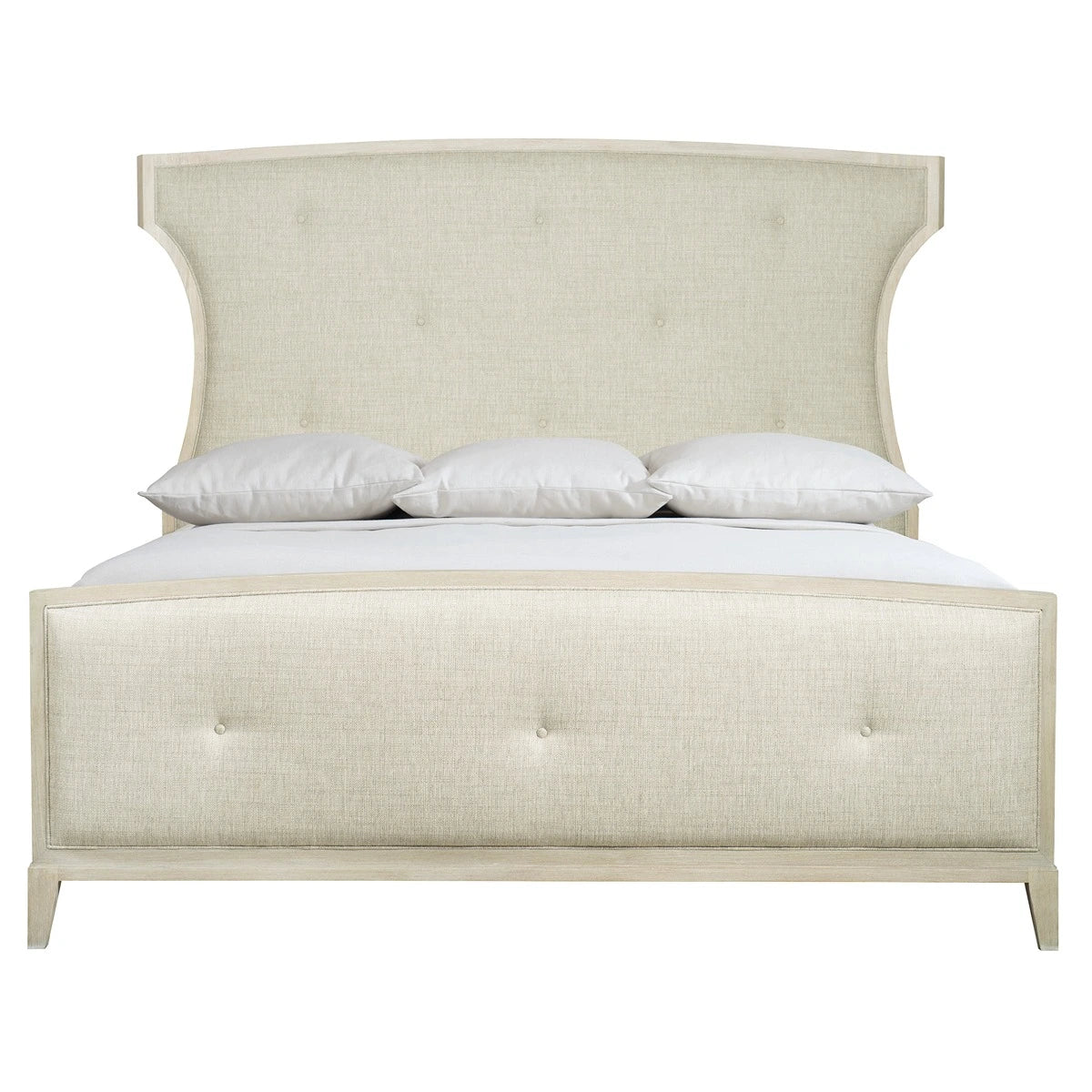 The East Hampton upholstered bed finds the perfect balance between celebrated tradition and understated modernity. A clean minimalist aesthetic combines with refined proportions and graceful curves. On the frame, quartered ash solids and veneers are finished in a subtle Cerused Linen. For a slightly feminine look, inset upholstered panels on the headboard and footboard feature button tufting and welt trim. Muted gray fabric with a subtle weave adds softness and texture.