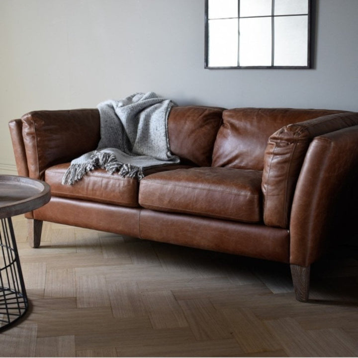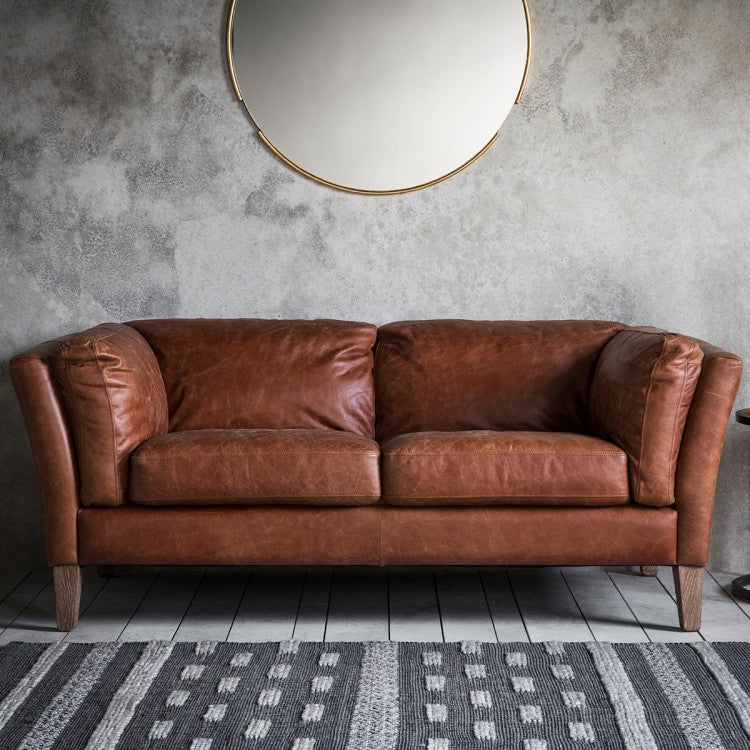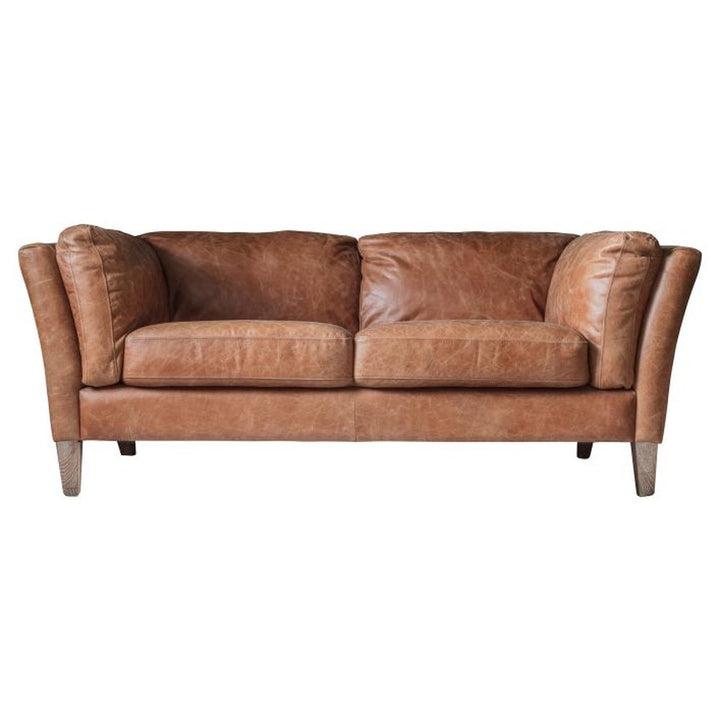 A stylish 2 seater sofa covered in top grain mellow brown vintage leather with solid ash legs and padded arms for extra comfort.
