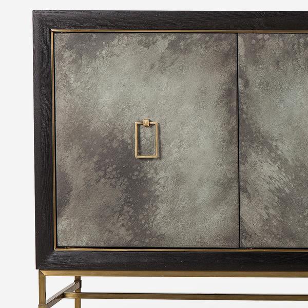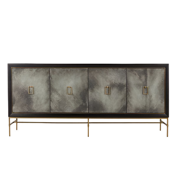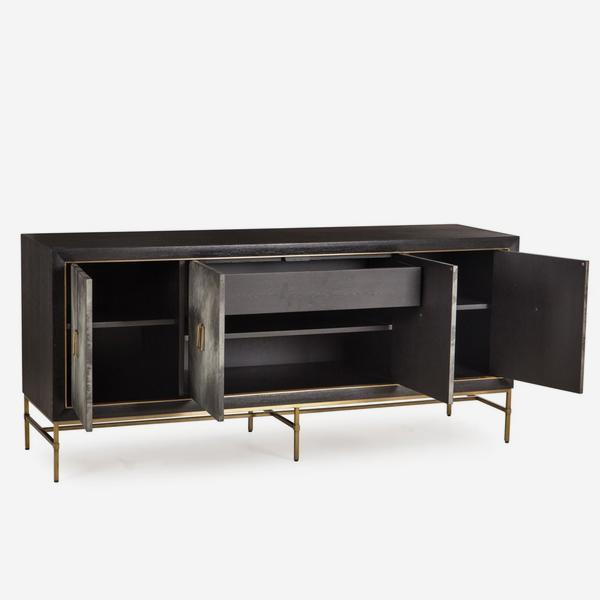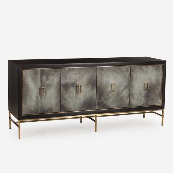 The Andrew Martin Edith cabinet is a stunning item featuring four cupboards, making it ideal for home storage. This matte black cabinet is made of wood and rests on a satin brass frame. The cupboard doors feature a natural charcoal wash and have feature handles, also in satin brass.