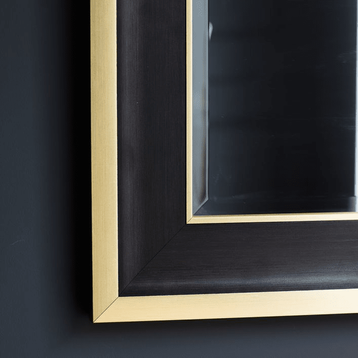 Sophisticated wall mirror with a black and gold finish frame.
