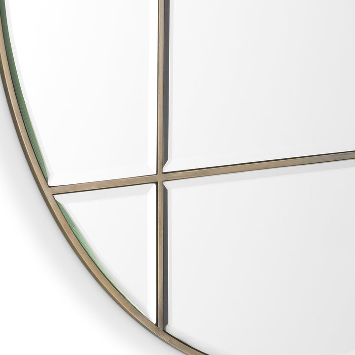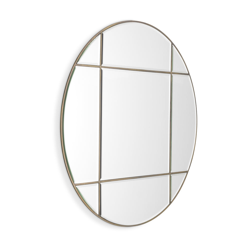 Set to embellish your interior, the round Mirror Beaumont features a sleek metal frame in a vintage brass finish that adds a flair of glam to any room. Its panelled design segments the bevelled mirror glass, breaking up the reflective plane and enhancing the traditional look.