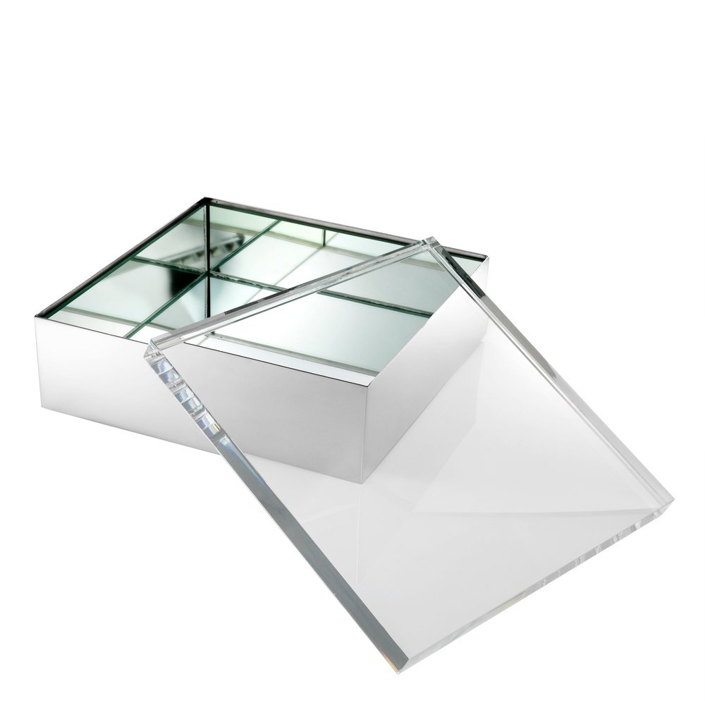 The square Brook Box has a lid of clear acrylic and a mirror glass interior for the ultimate display of decorative objects such as precious stones. The exterior of the case features a nickel finish.