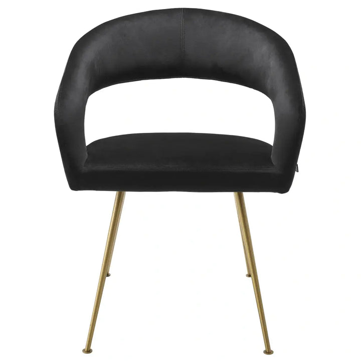 Add character to your dining room with the Bravo Dining Chair. Combining the elegance of 50s furniture with modern-day design. The smooth Roche black velvet upholstery gives this chair an inviting feel, while the brushed brass tapered legs add a contemporary and luxurious look to your home.