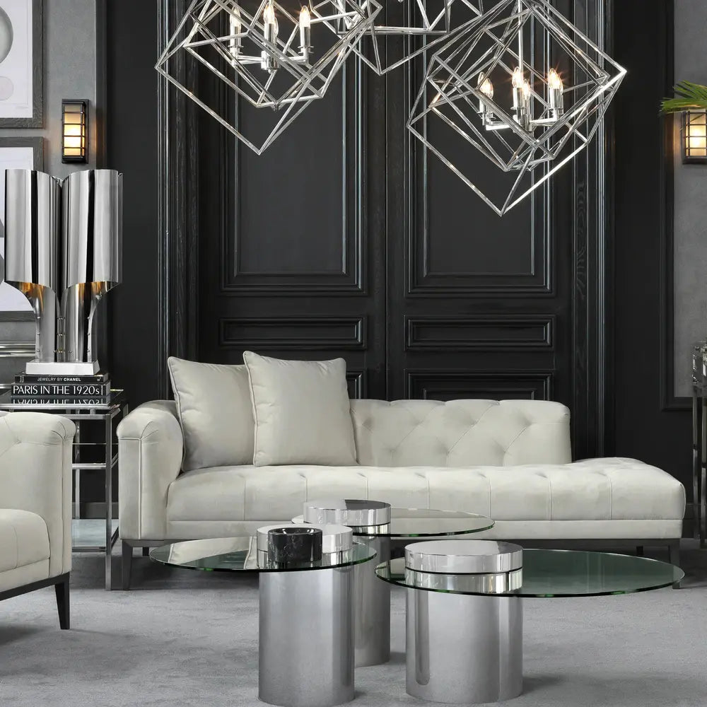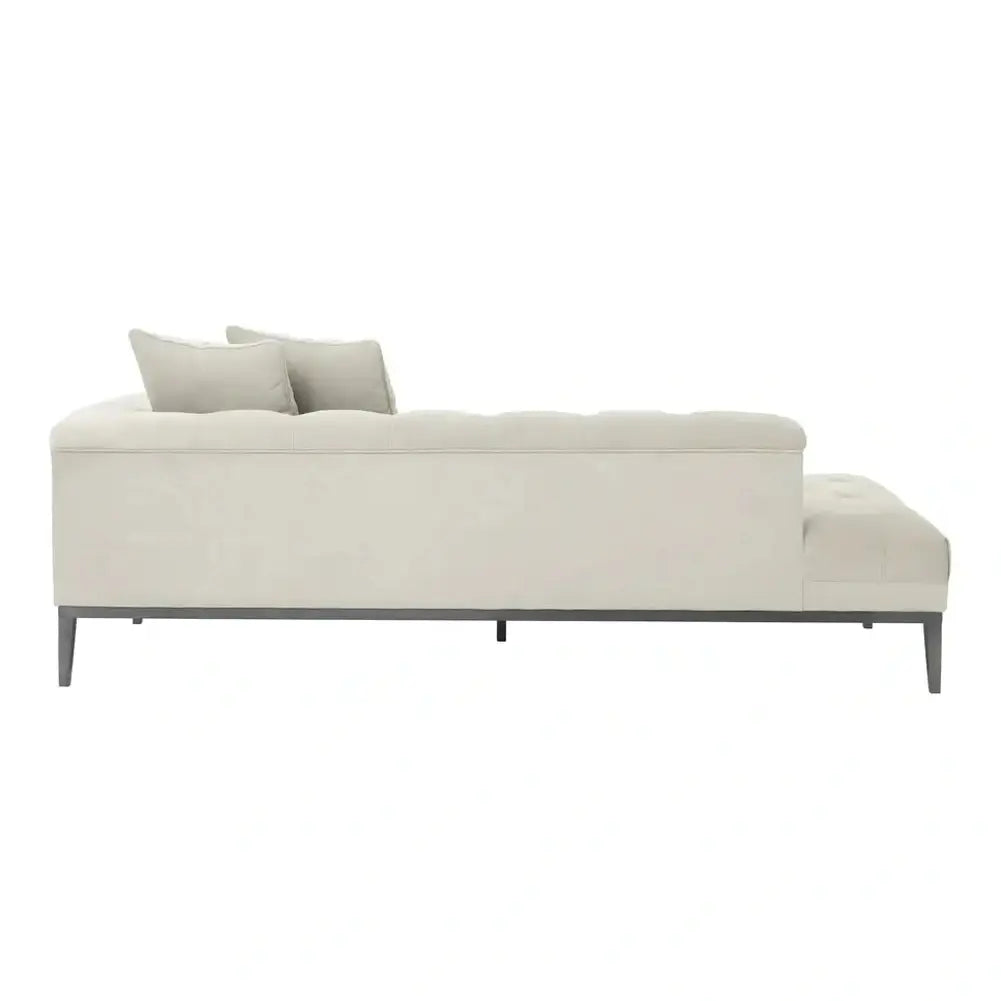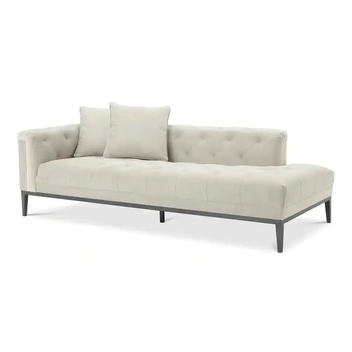 Inspired by the classic Chesterfield furniture, the Cesare left Lounge Sofa in pebble grey upholstery offers a more subtle button back design, gently curving with straight line embroidered stitching. It’s presented with a black gunmetal base for a monochrome contrast. Scattered cushions provide a homely comfort.