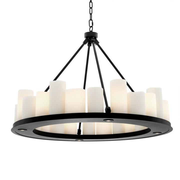 The robust black finished frame of the Commodore Chandelier is supported by a strong chain link ceiling canopy. It features a plate with 24 tapered faux pillar candles which suggest the authentic formation of melting wax. The bottom of the plate features 4 recessed LED downlights. The lights in this chandelier can be turned on and off by using the included remote control. Several different settings are possible. This chandelier is not dimmable and cannot be used with a dimmer. Create a warm and welcoming ambience with the Commodore Chandeliers. Combining the soft glow of candlelight with gothic appeal and industrial modernity, these distinctive chandeliers will make a radiant addition to your interior scheme.