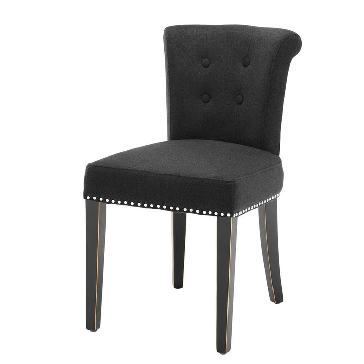 Pull the Key Largo Dining Chair up to your dining room table to enjoy sumptuous dinners with friends and family. A modern twist on classic style, this charming dining chair with black cashmere upholstery, nickel studs and handle detail, and black legs offers the perfect accent for luxury entertaining.