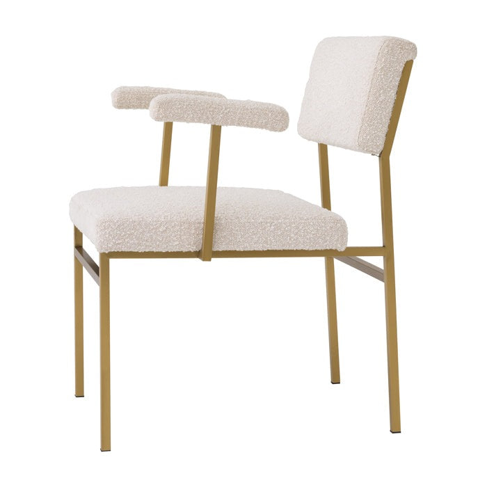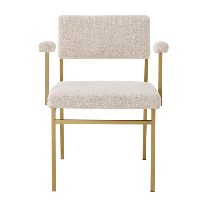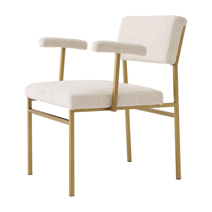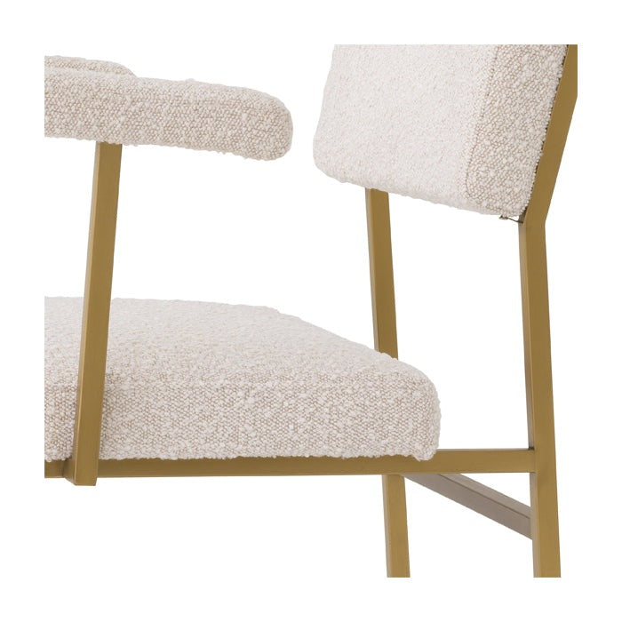 Its soft touch cream-coloured bouclé upholstery creates an intriguing contrast compared to the sleek metal frame with brushed brass finish.