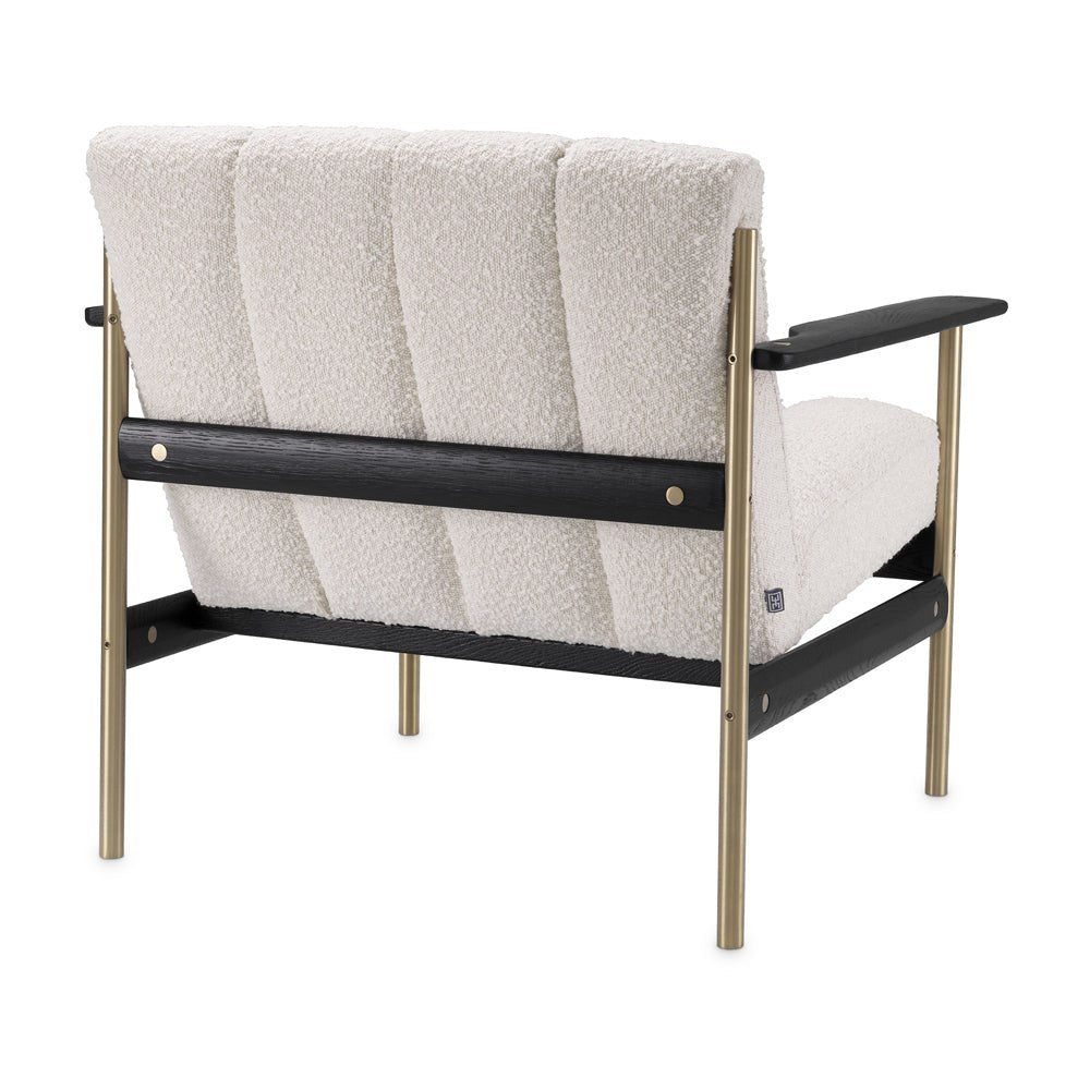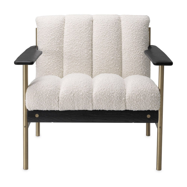 Plump yet refined, Chair Elan pairs ultimate comfort with sleek proportions for modern living. The brushed brass finish frame has armrests and connecting pieces of black finish wood with an open grain structure, while the seat and backrest are upholstered in Bouclé cream and provided with deep-channel stitching.