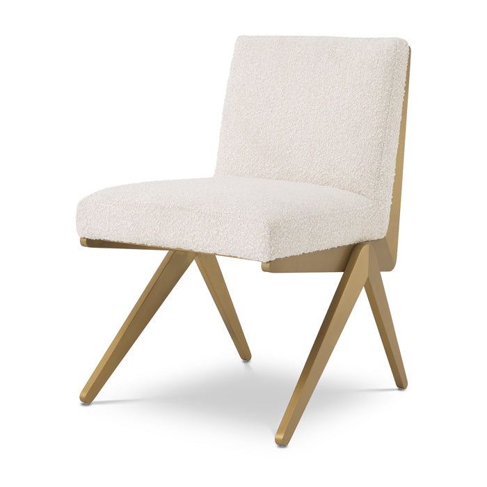 Featuring a brushed brass finish frame and cream-coloured bouclé upholstery, it will be a comfortable and stylish addition to your dining area.