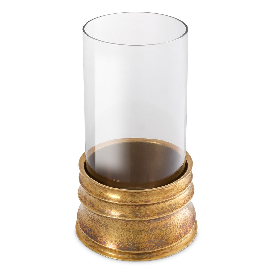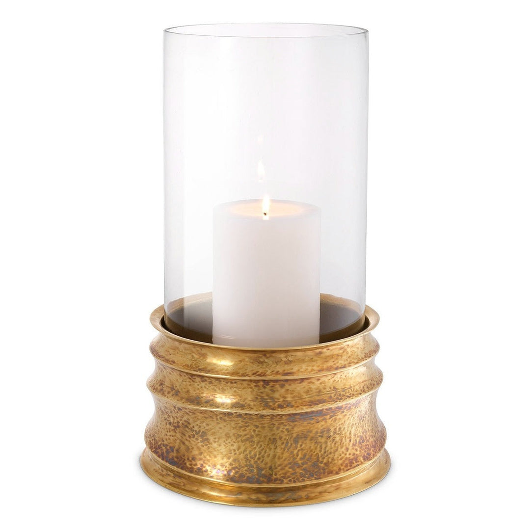 The flickering glow of a candle is perfect for a touch of globally inspired romance. Lend your living room a warm touch with Hurricane Gilardon. Handmade from brass, this stylish candle holder features a hammered vintage brass finish. A clear glass cylinder completes the look.