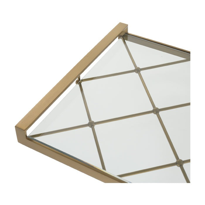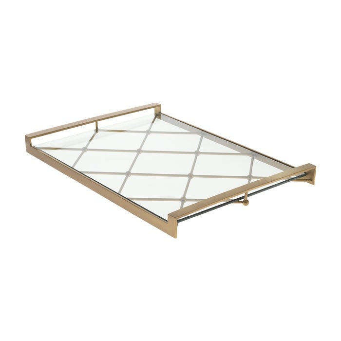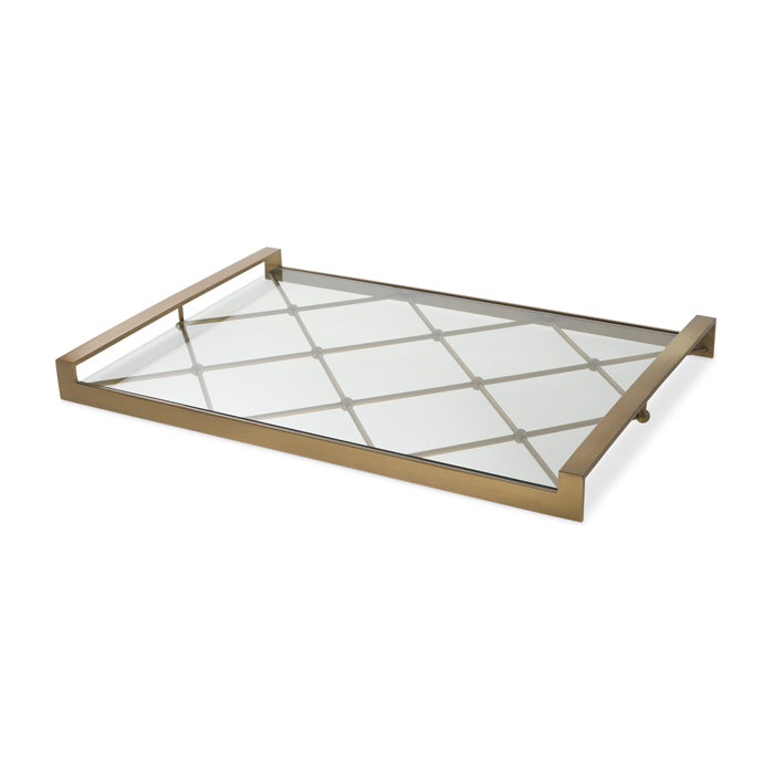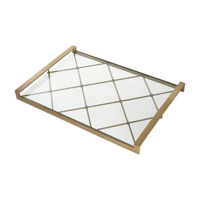 The Goa Tray has a diamond-patterned polished stainless steel frame with rectangular handles and a clear glass plate.