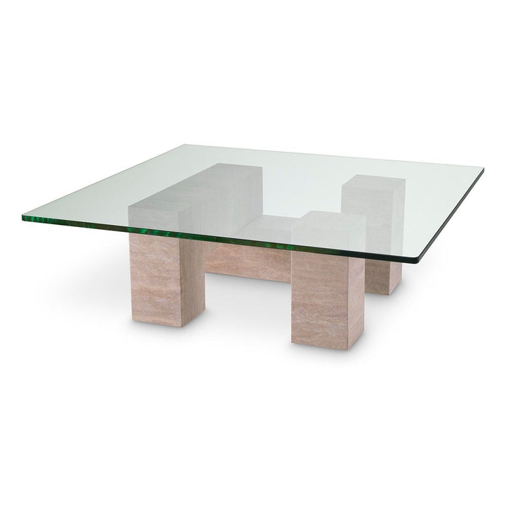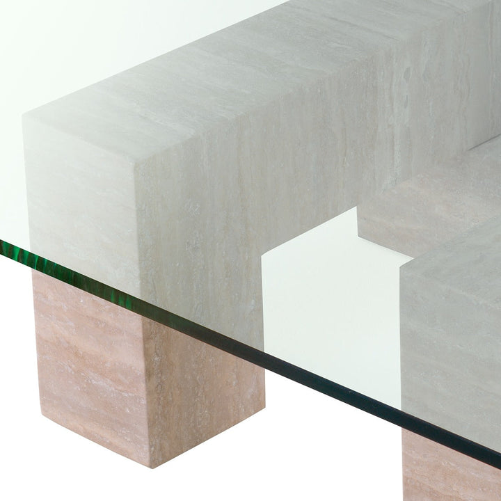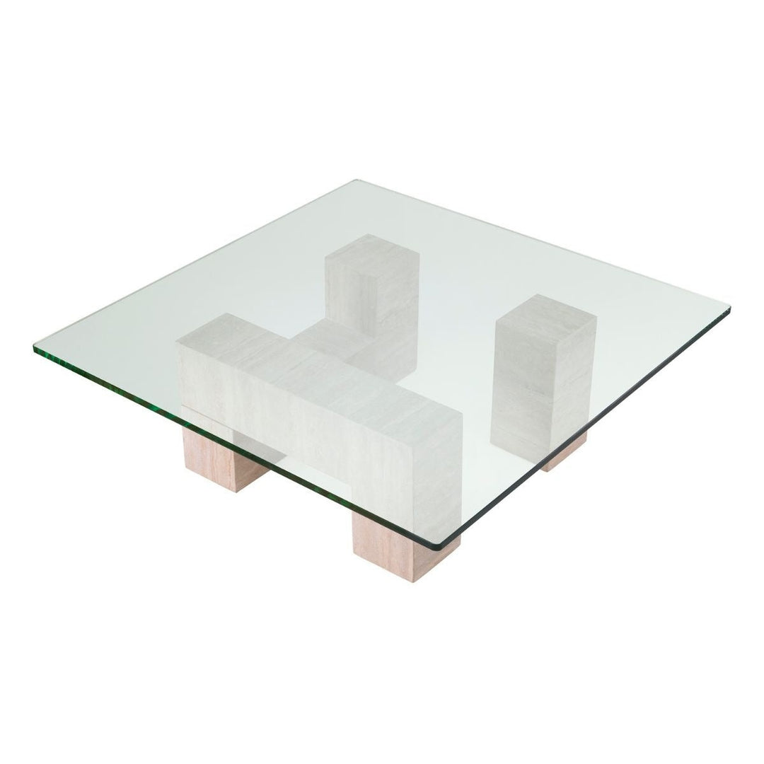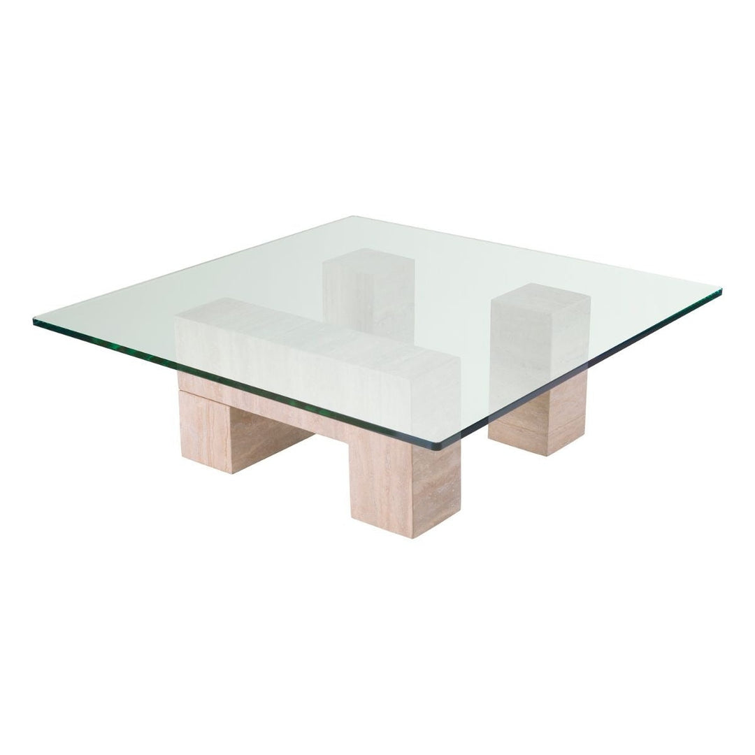Balance geometry and organic beauty in your home with the Ikal travertine and glass coffee table. Three blocks of solid travertine, a type of natural limestone celebrated for its unique texture and makeup, are placed together to create a table base with clear glass on top. Appreciate the distinctiveness this beautiful piece will add to your home.