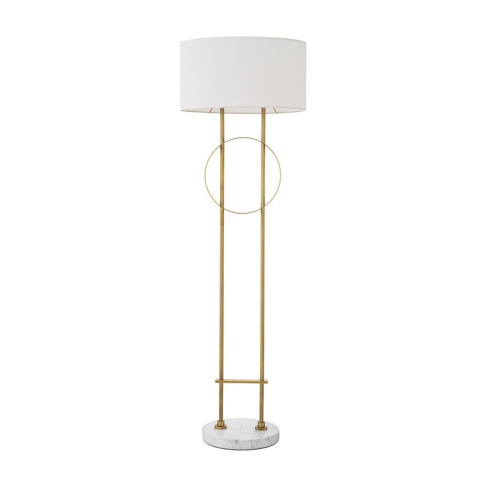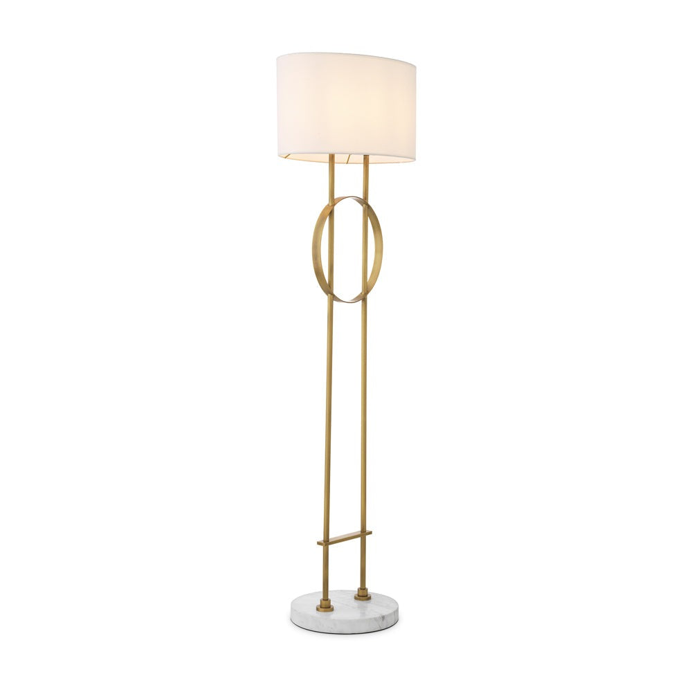 Showcasing an updated take on Art Deco, Floor Lamp Kaiser exudes transitional allure. Characterised by a geometric line play, the antique brass base gives this contemporary floor lamp a stylish look with an air of luxury. It sits on a circular white marble plinth and is supplied complete with an off-white fabric oval shade.