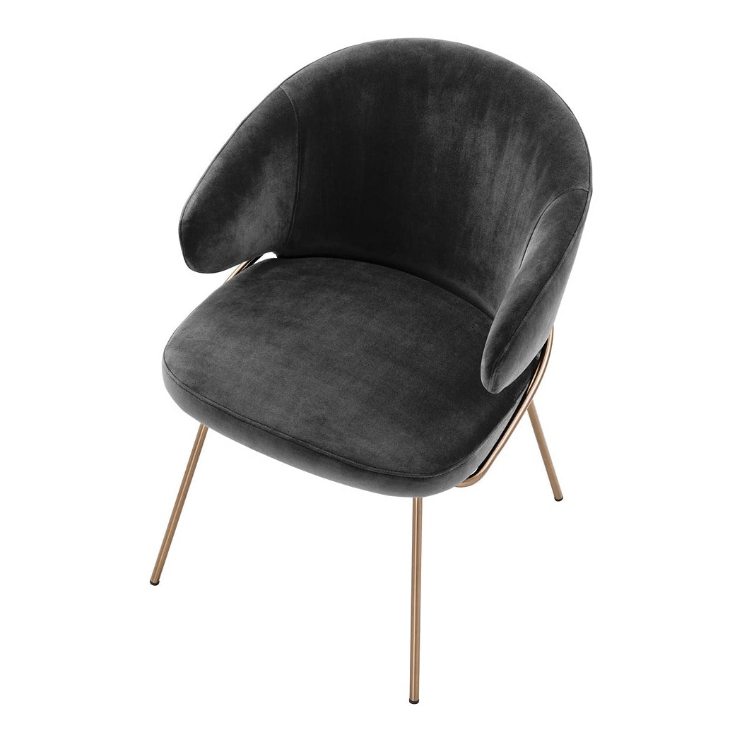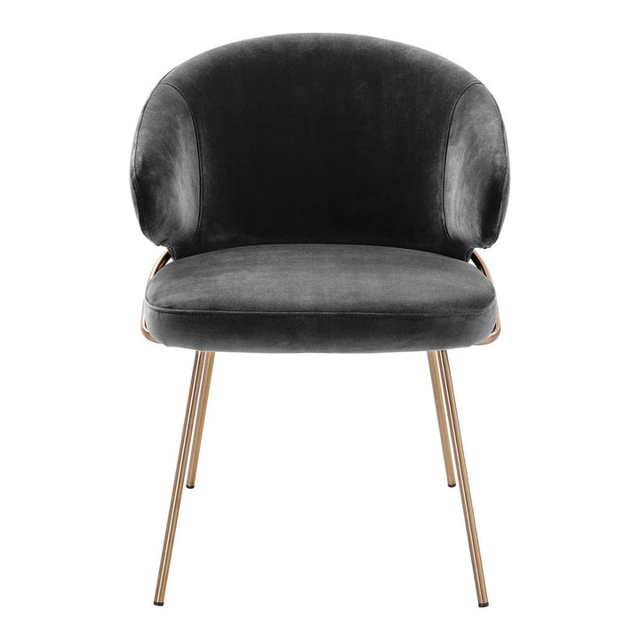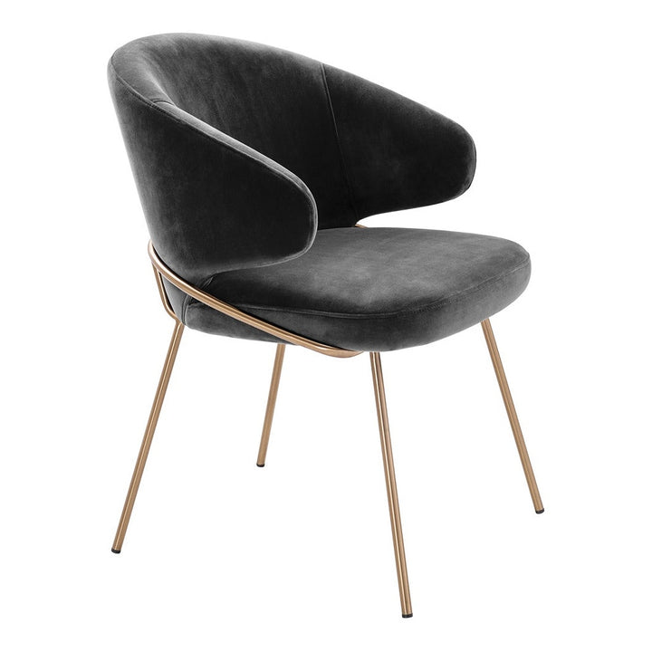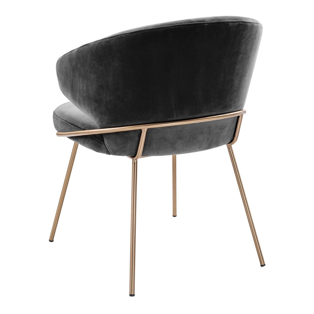 Host your guests in style with the Kinley Dining Chair. With a bent backrest and a seat in a nude velvet upholstery and brushed brass legs, this eye-catching armchair exudes Mid-Century Modern flair.