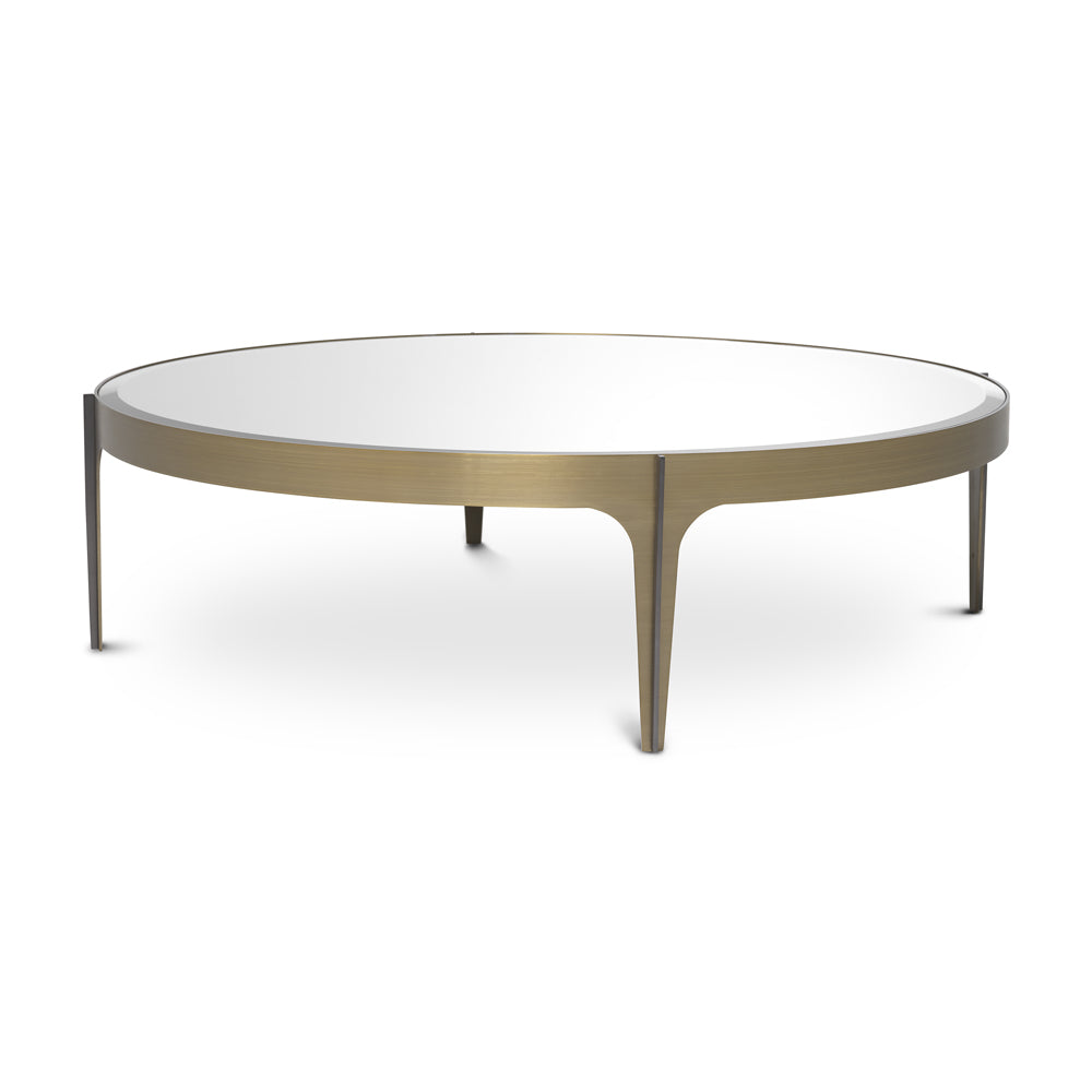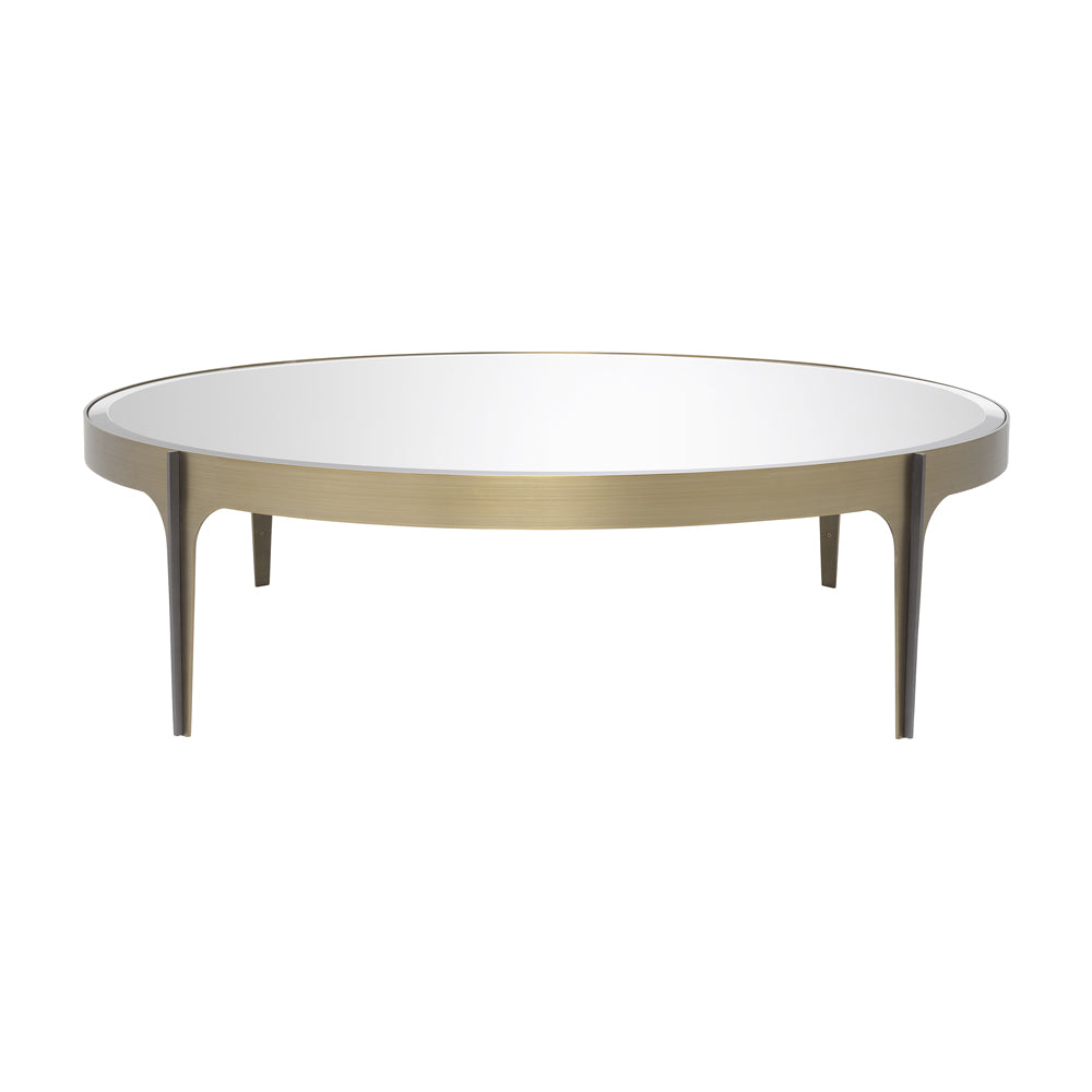 With a Mid-Century Modern design and chic appeal, the large Coffee Table Artemisa makes a statement with an elegant metal frame in a brushed brass finish. The interior curves of the frame are accentuated by sleek bronze bars on the legs and a round tabletop of bevelled mirror glass, bringing focus to the spaciousness within the solid materials shaping this piece. Combine with the small Artemisa Coffee Table for a balanced look.