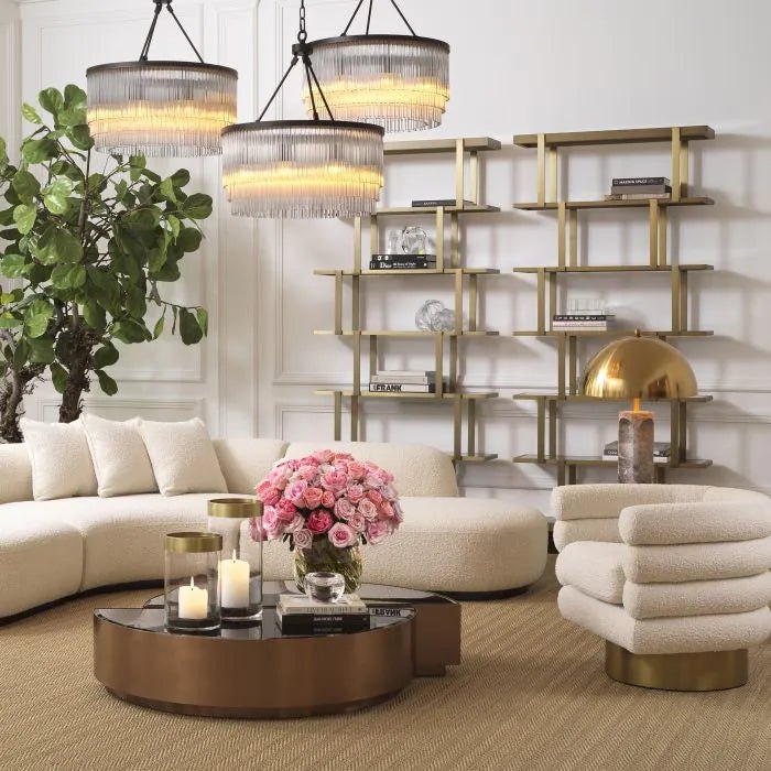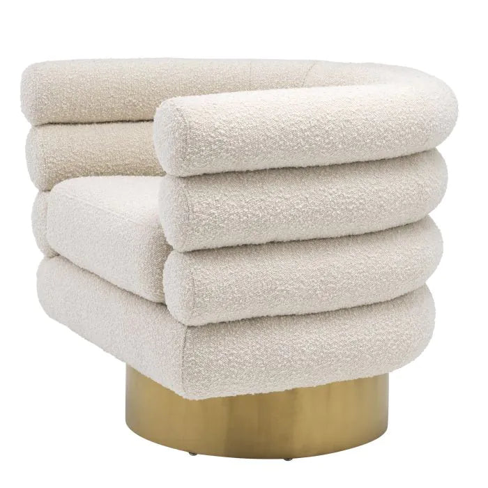 The fabulous Maguire Swivel Chair oozes a touch of decadence with its bouclé cream upholstery and brushed brass finished swivel base. Its silhouette is inspired by Streamline Moderne, an international Art Deco design style from the 1930s that is characterised by soft curving forms and long horizontal lines. Finish/Colour: Cream, beige