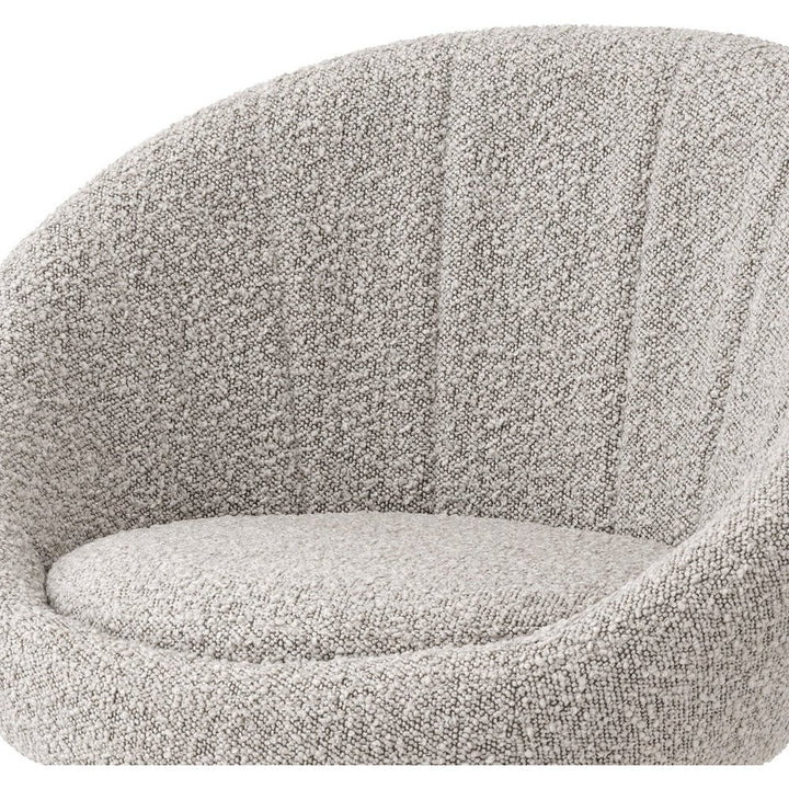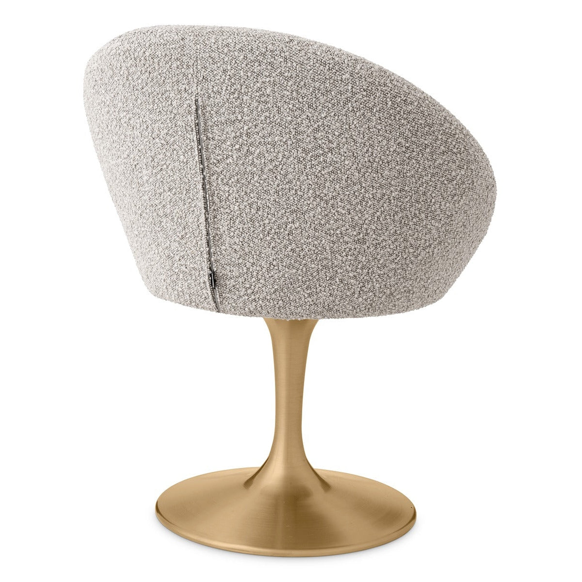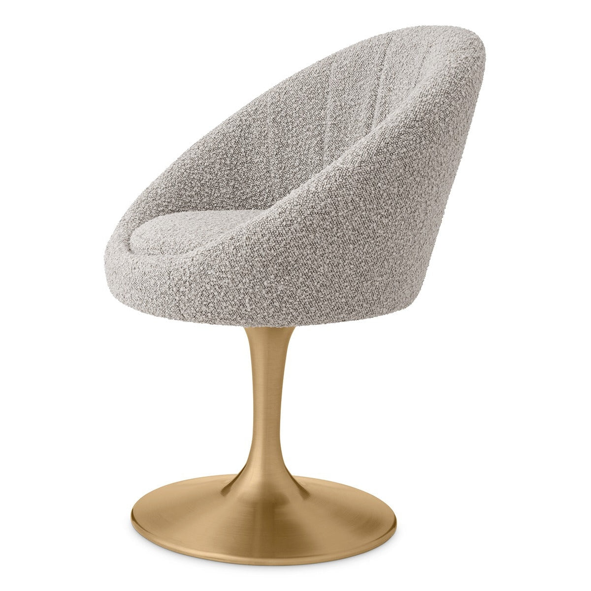 An elegant upholstered bouclé grey curve meets a sleek brushed brass finish swivel base for an organic dining chair with a modern flair. Discover an ergonomic, contemporary design that conforms to the human body for maximum comfort with the O'Neill Dining Chair. Vertical tufting and a swivel base completes this chair's alluring profile.