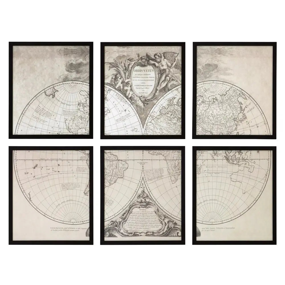 The Prints Orbis Vetus set mixes global inspiration with vintage style. This exquisite set includes 6 individual prints that when combined form the shape of the earth from two perspectives. Two of the prints also feature further detail with elegant script aspects. Each print in the stunning set comes with a black finished wooden frame and a clear glass panel.