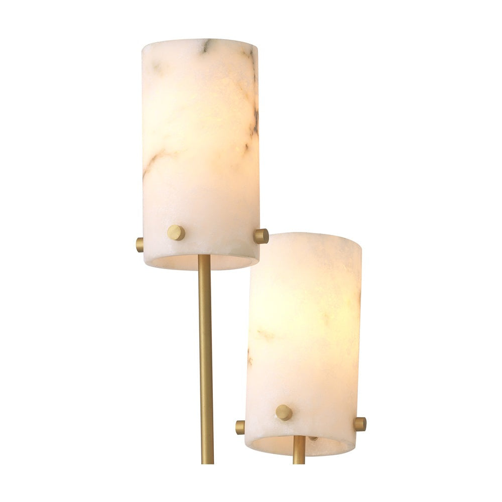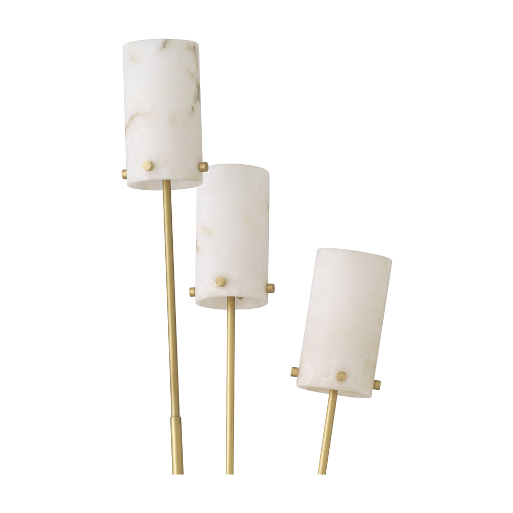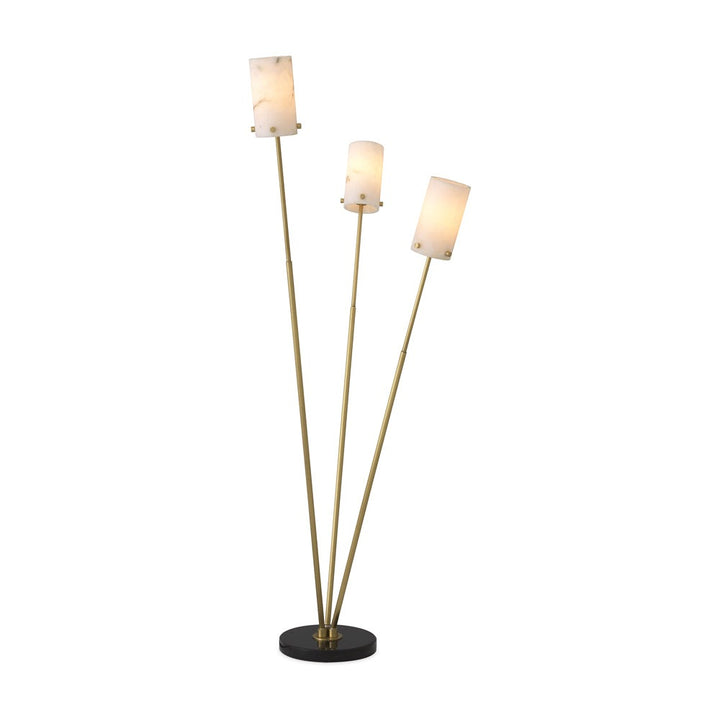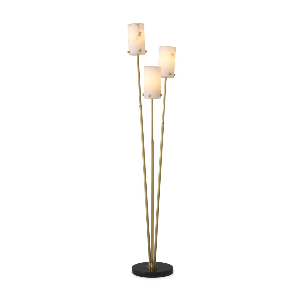Floor Lamp Rodolpho stands for a homely light. As a supporting light, this 3-bulb luminaire conjures up a cosy ambience. Ideal for lighting up a dark corner in your living area or bedroom. The three lamp holders are fitted on antique brass stems that fan out from a round base of honed black marble. The tubular lampshades are made of translucent alabaster.