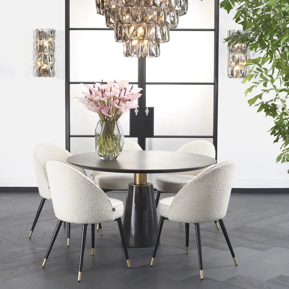 Add Mid-Century Modern appeal to your dining room or kitchen with this stylish set of 2 Cooper dining chairs. Elegantly shaped and designed for everyday living, each chair is characterised by a seating and backrest in cream-coloured bouclé, and tapered black legs with brass caps.