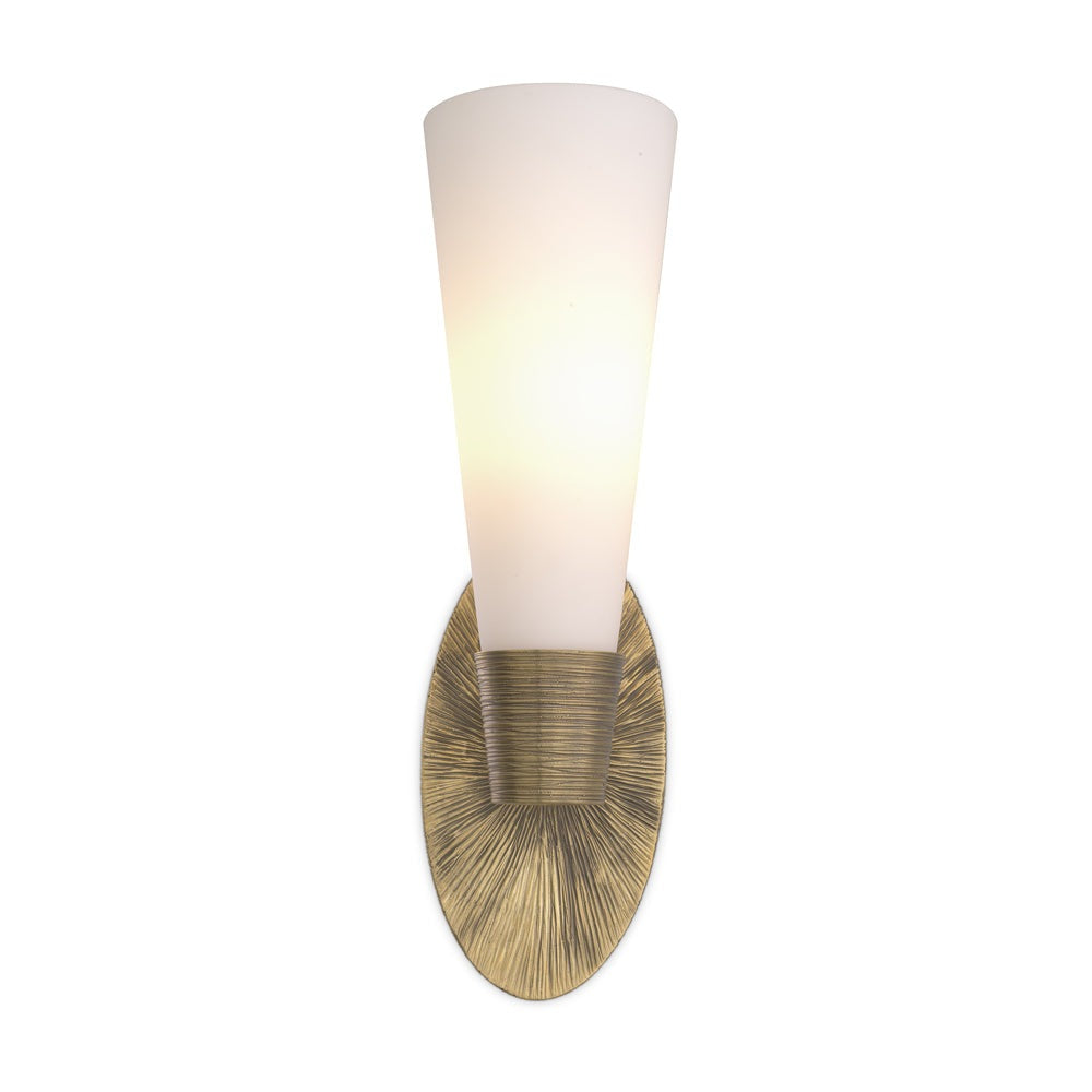 By pairing contemporary style with classic features, our single Wall Lamp Nolita radiates timeless elegance, making it a perfect fit for both modern and traditional décors. The fixture has a vintage brass finish that is beautified with a time-weathered look, contrasting nicely with the conical shade of white glass.