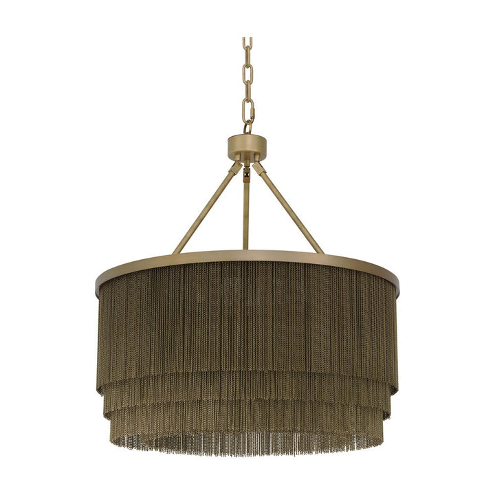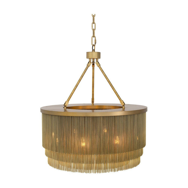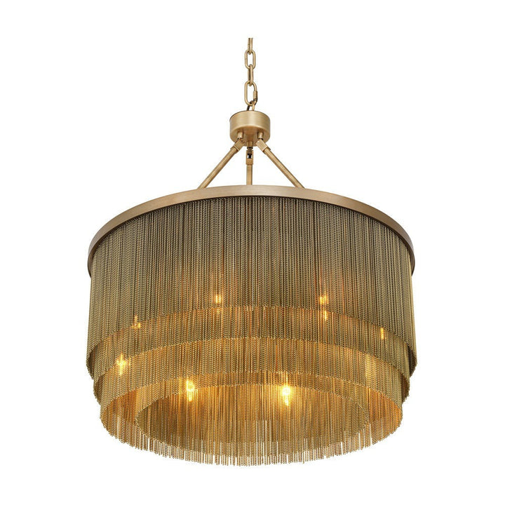 Provided with an antique brass finish, the small Tissot Chandelier lends a fanciful touch to your space due to its eye-catching design. With four rows of thin chains that remind one of fringe flapper dresses from the 1920s, it radiates the glamour and extravagance of The Great Gatsby. Combine with the large Tissot Chandeliers for added dimension.
