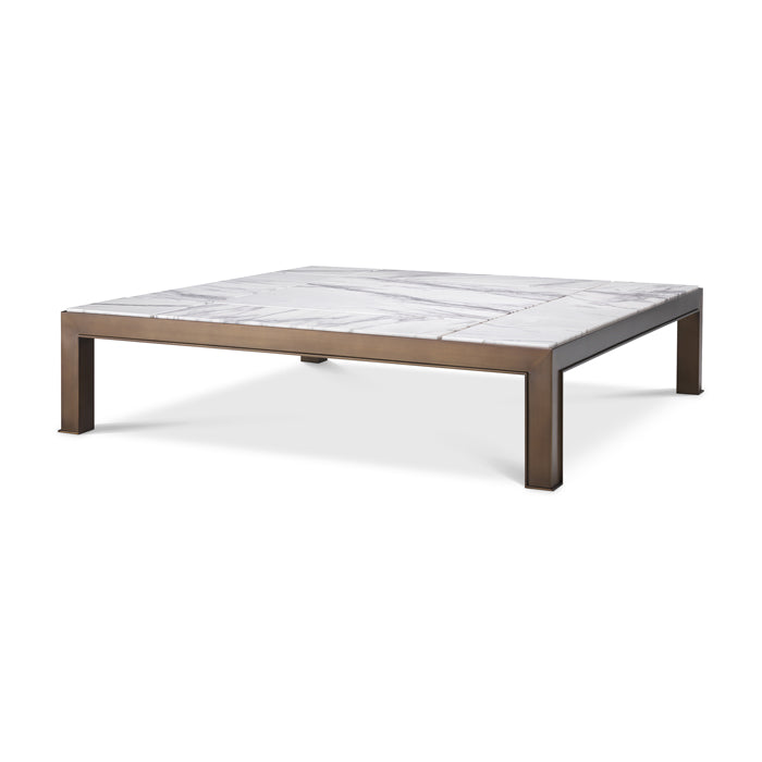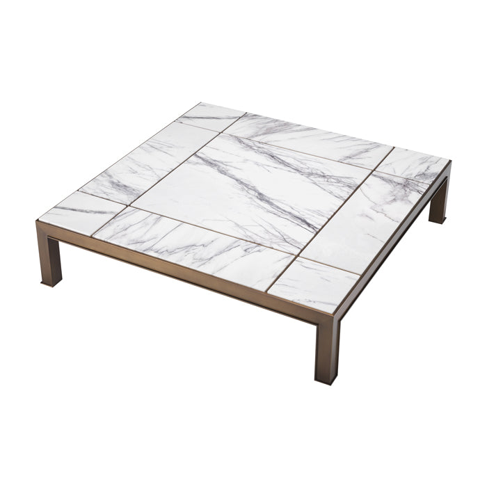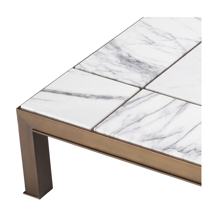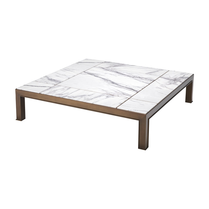Featuring clean lines, this handsome contemporary piece has a sturdy antique brass finish frame with an inlaid top of Italian bianco lilac marble.