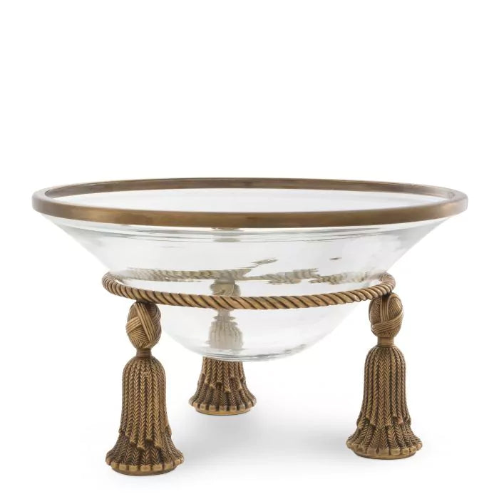 Create added sparkle in your interior with the Tassel Bowl. This clear glass bowl with vintage brass rim has refined designer style. It rests on a vintage brass frame with three tassel-shaped feet