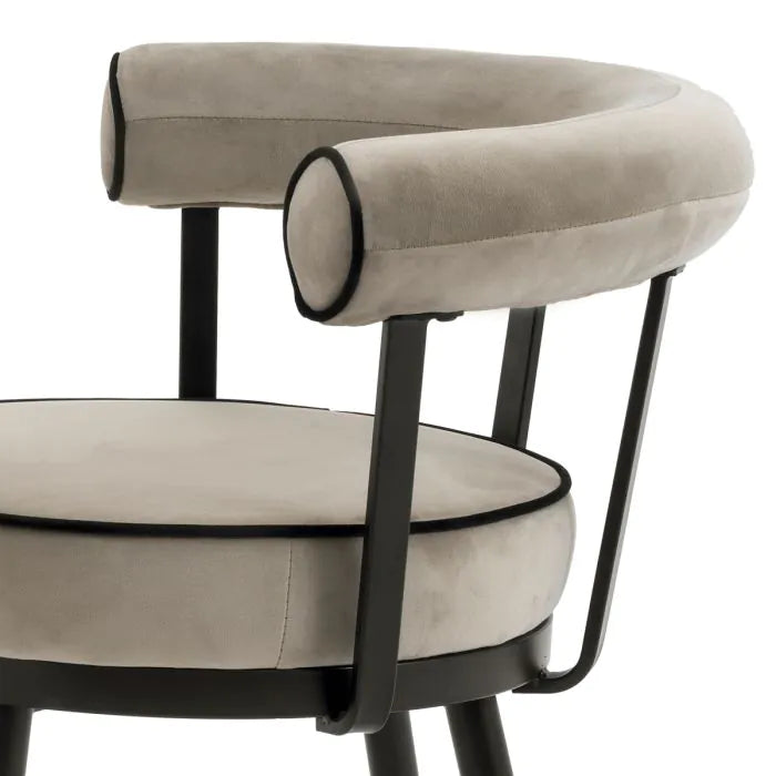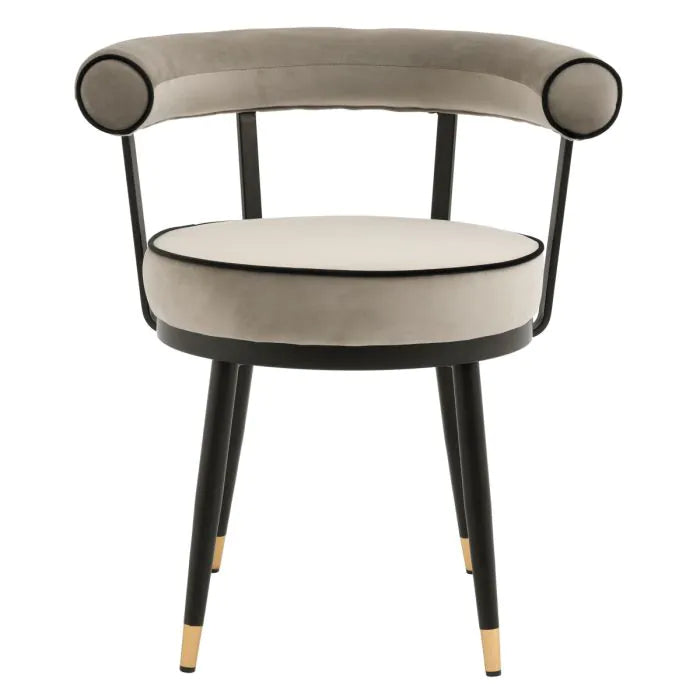 Dining Chair Vico is the ultimate proof that a retro-inspired look never goes out of style. Featuring a beautiful curved backrest, this vintage style chair is the ideal piece to upgrade your dining room. Its distinctive profile offers an open, airy look while the tapered black legs and Savona greige velvet upholstery with black piping add modern flair. Finish/Colour: Greige