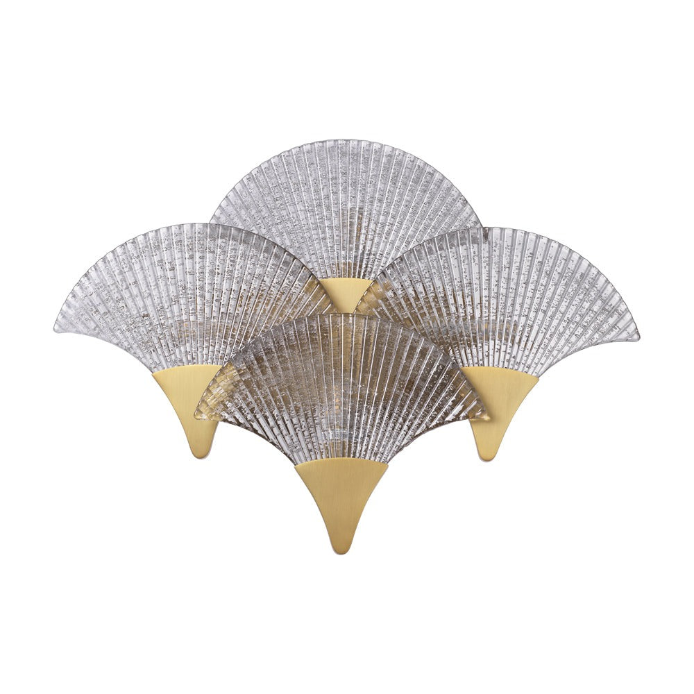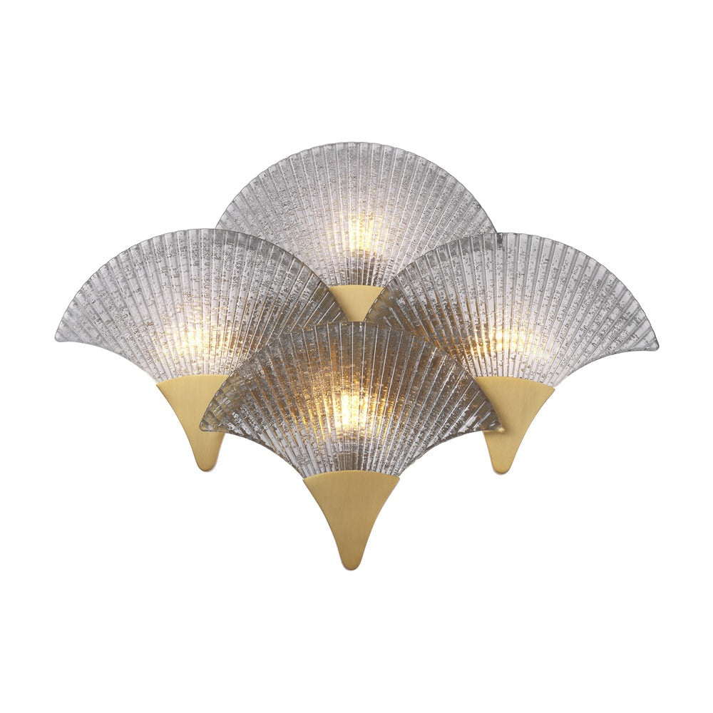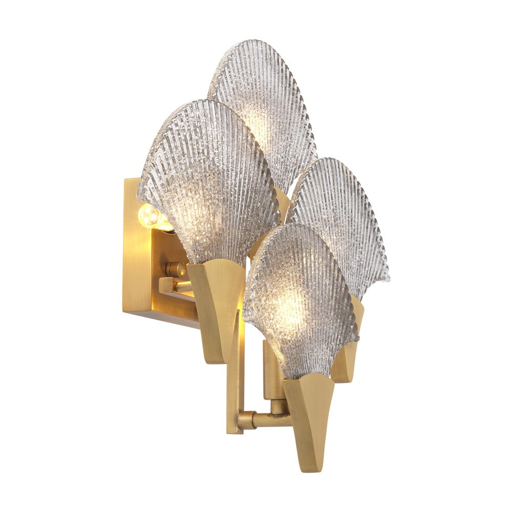 Consisting of four fans that partly overlap, the Vitae Wall Lamp immediately evokes associations with designs from the heyday of Art Deco. The fixture is provided with an antique brass finish and the shades are made of ribbed smoke glass.