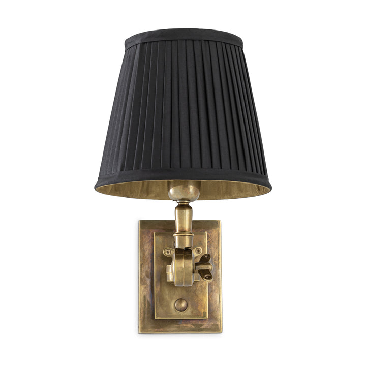 Invite boutique hotel elegance into your interior décor with the Wentworth Single Wall Lamp. Inspired by classic wall lamps, this vintage brass fixture has an adjustable arm. It is supplied with a pleated black lampshade. The shade can be used in two ways, depending on the position of the arm. Rotated upwards, the shade can be fitted from below. Rotated downwards it can be fitted from above.