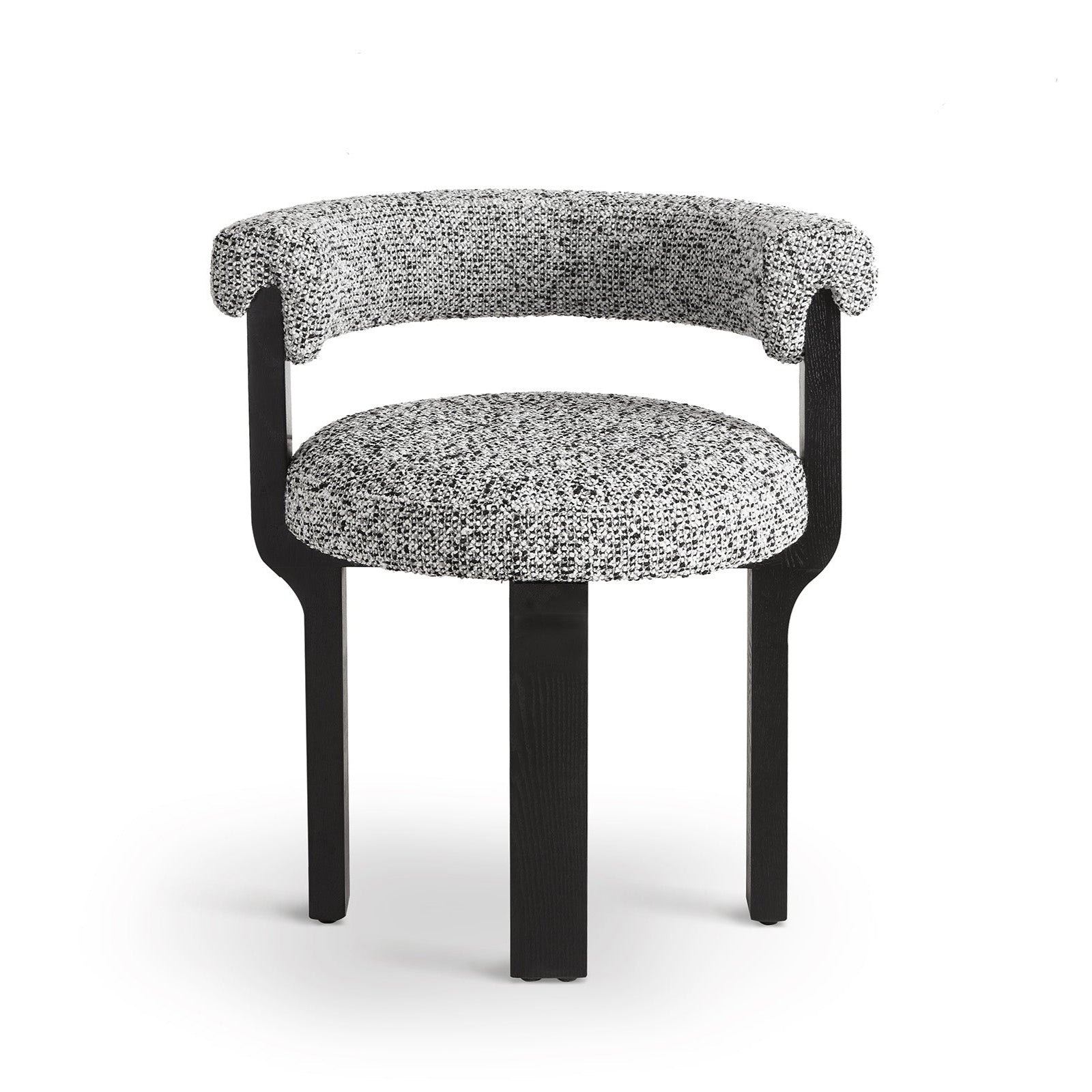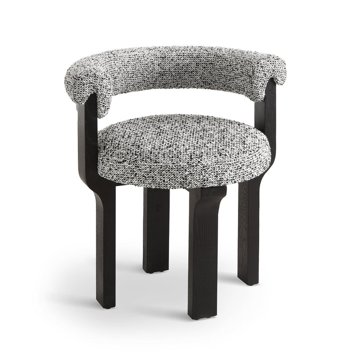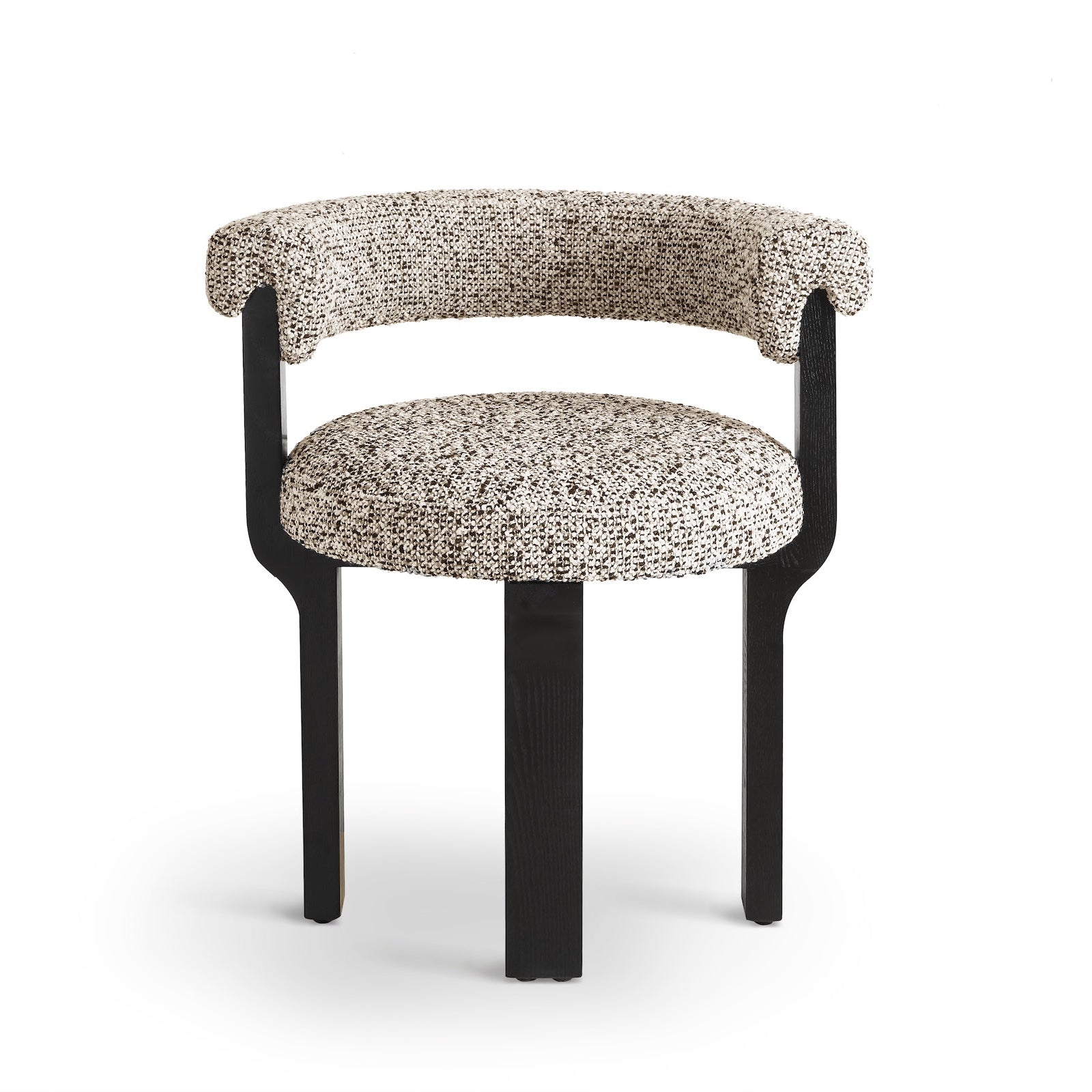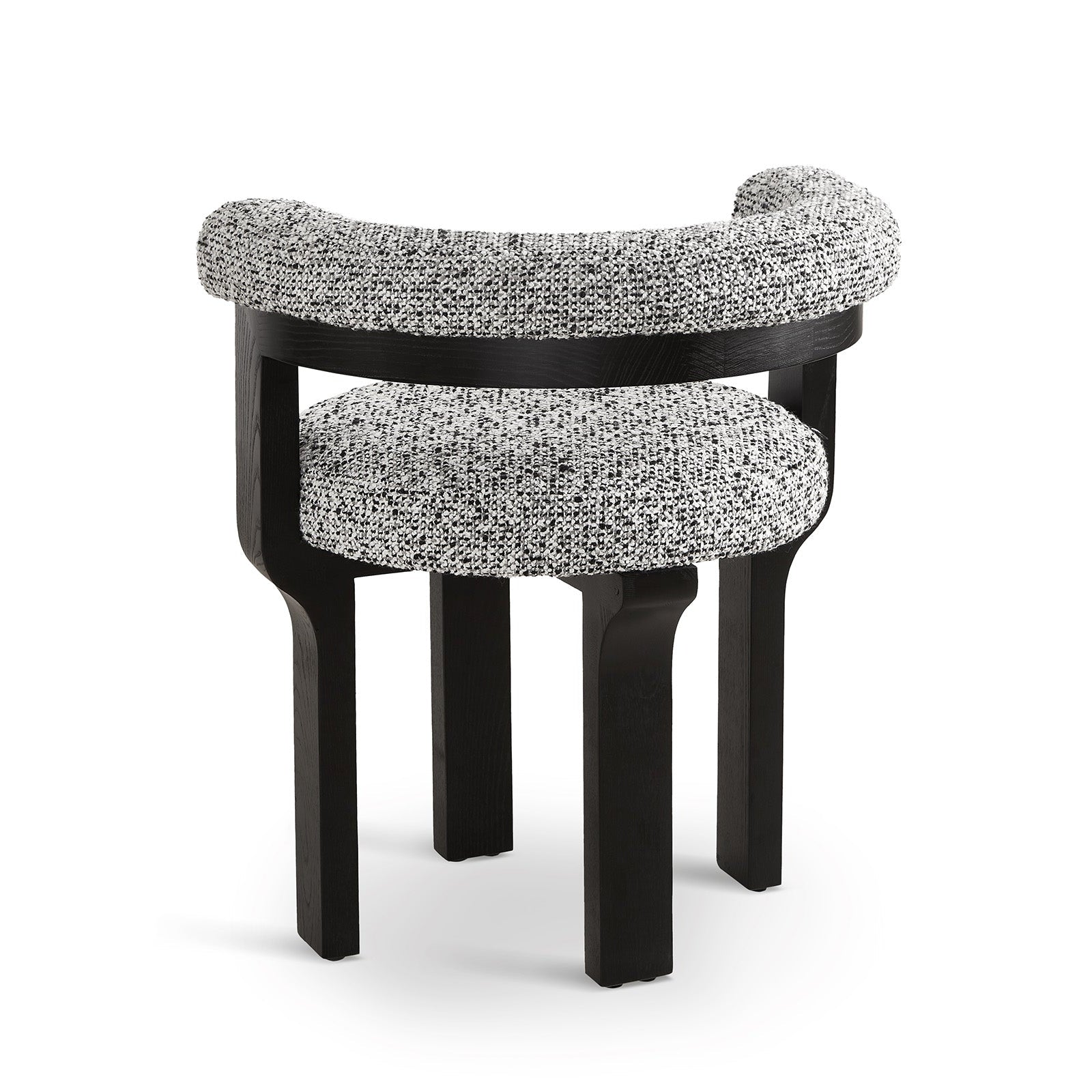 The Elba Dining Chair in Dexter Sparkle Stone Crib 5 upholstery and Matte Black blends sculptural elegance with everyday comfort. Its distinctive silhouette and rich texture make it a sophisticated addition to residential or hospitality interiors.