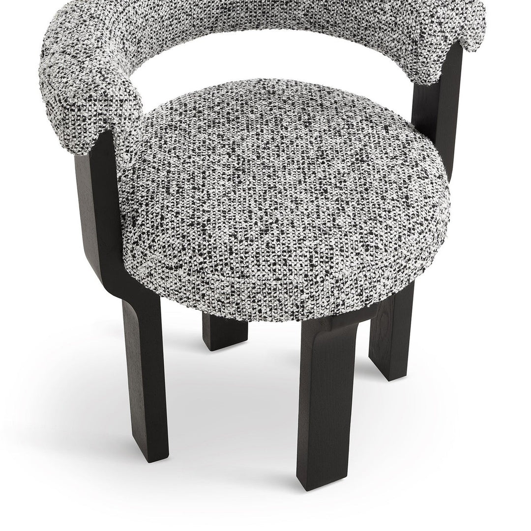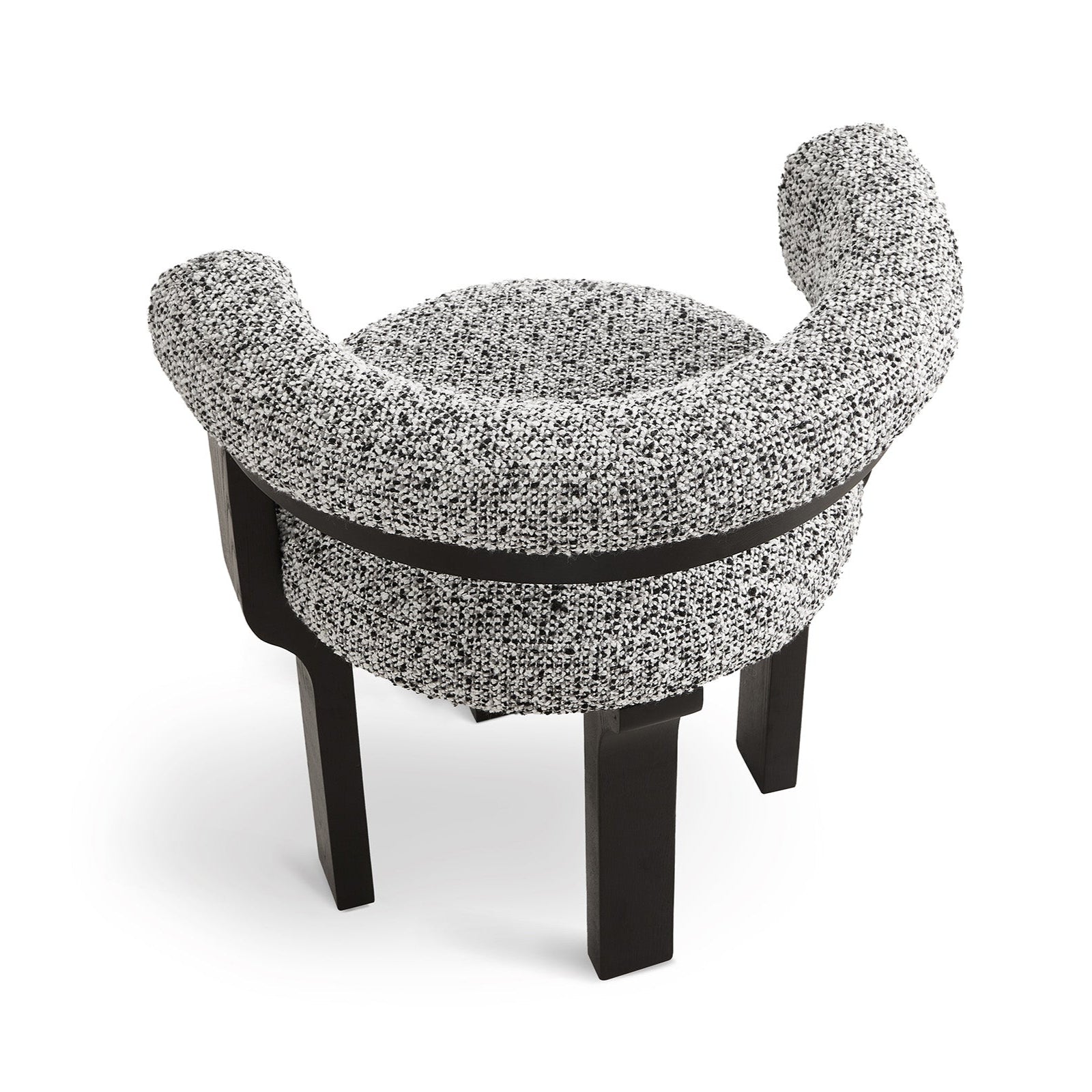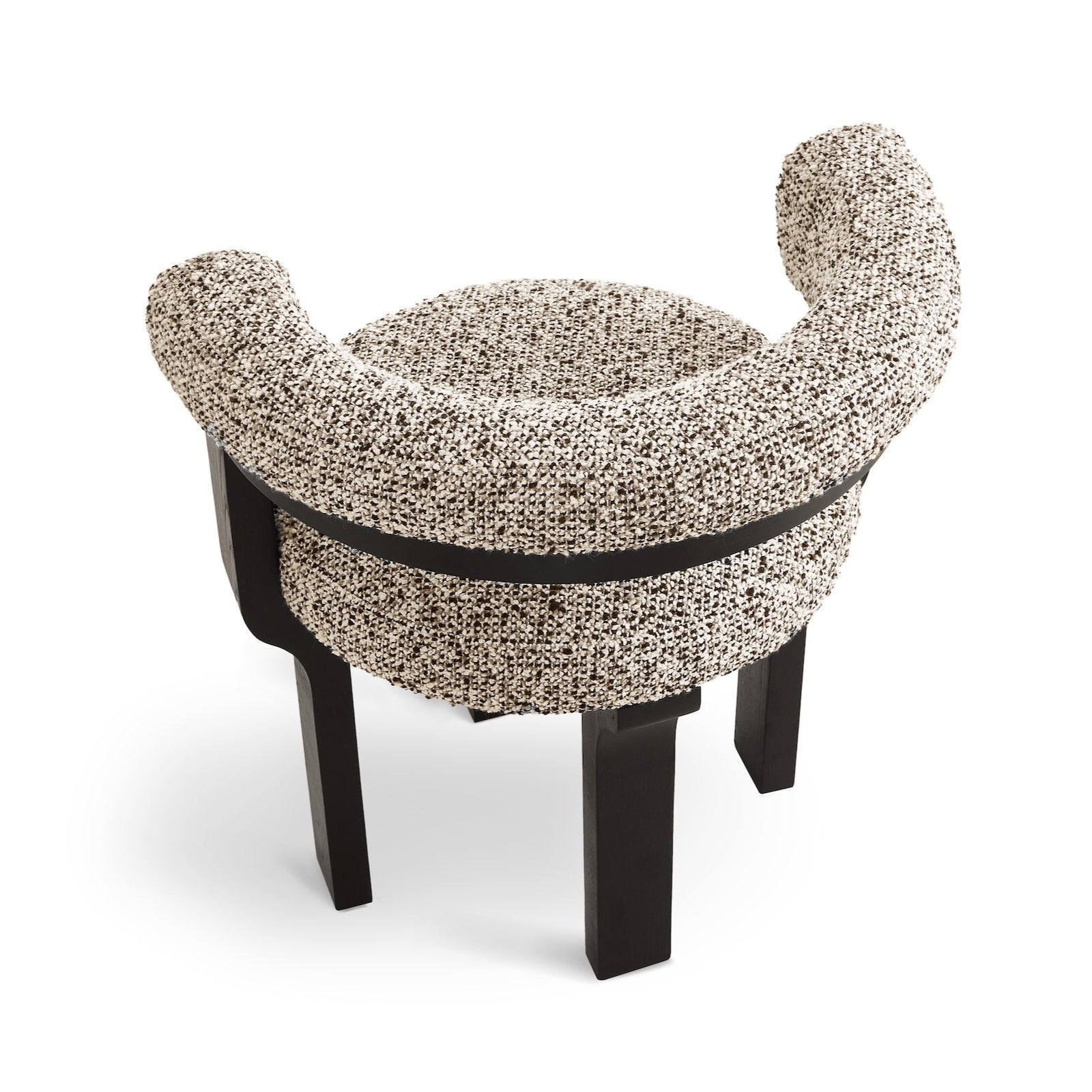 The Elba Dining Chair in Dexter Sparkle Stone Crib 5 upholstery and Matte Black blends sculptural elegance with everyday comfort. Its distinctive silhouette and rich texture make it a sophisticated addition to residential or hospitality interiors.